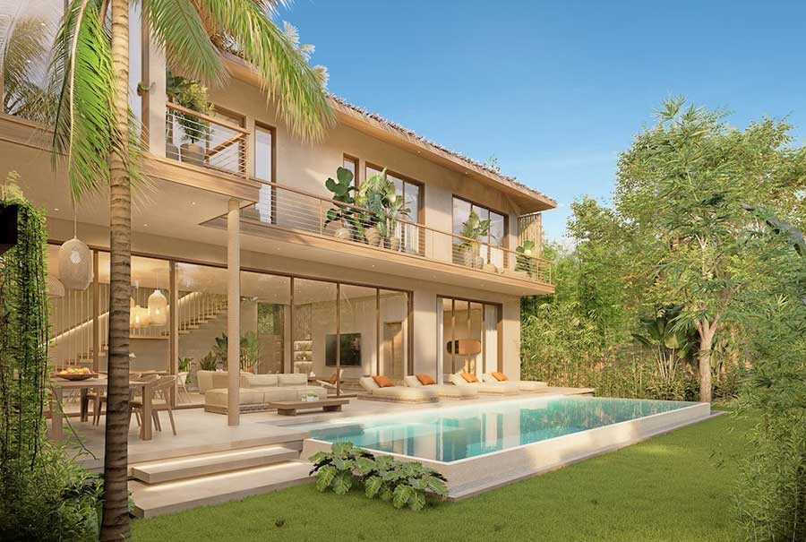 The total stated built area for the villas is approximately 443 sqm, set on land plots of around 430 sqm. Outdoor areas are centred around a large private infinity swimming pool, accompanied by a pool house and landscaped tropical garden. These external spaces are designed as functional living areas rather than purely visual features, supporting everyday use and entertaining.