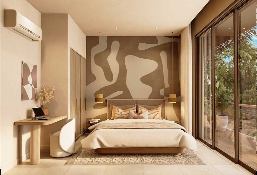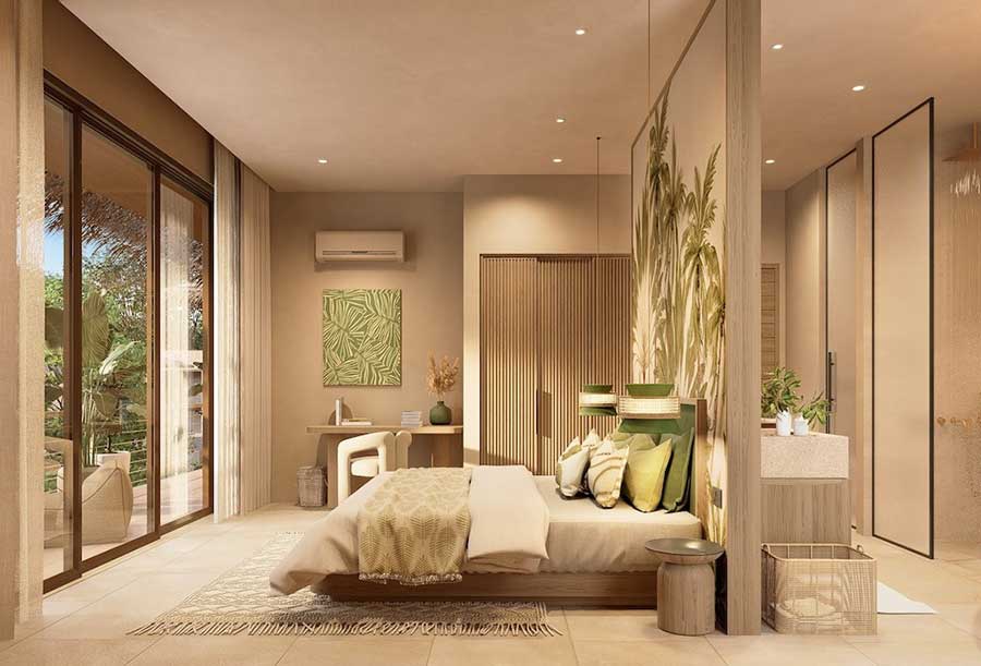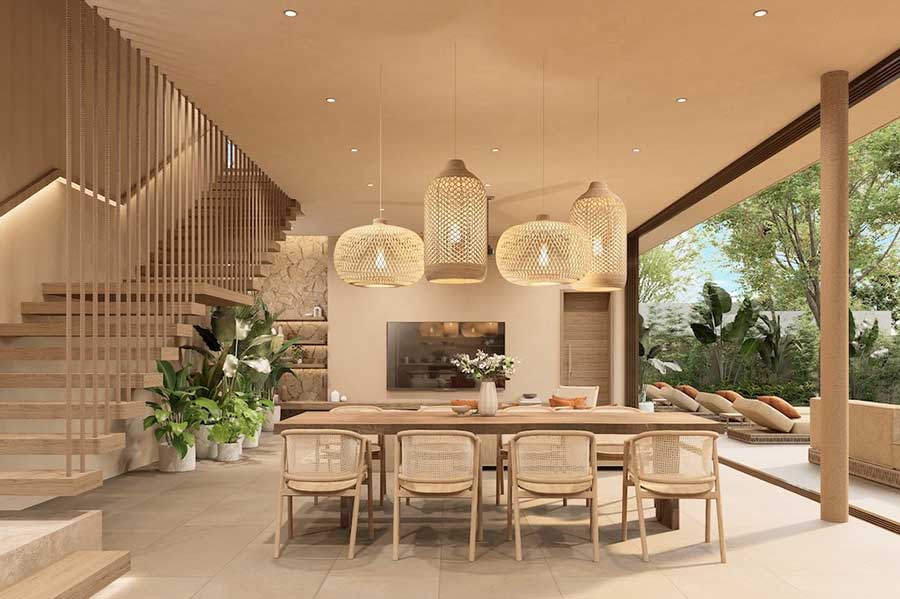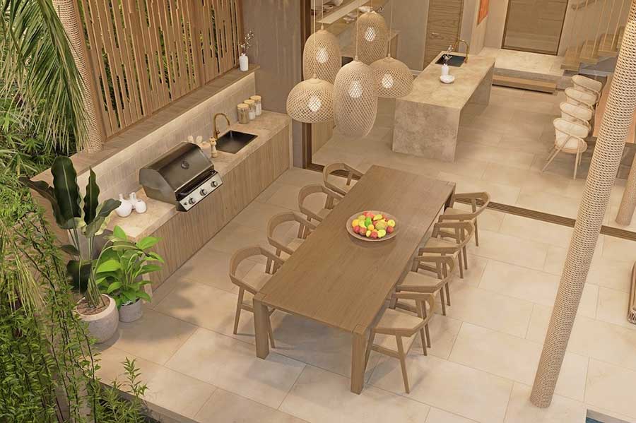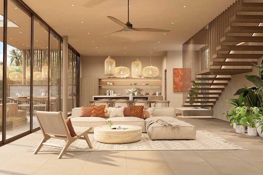 Architectural design across Pacific Noma focuses on contemporary tropical styling combined with natural materials. Features referenced in the source material include floor-to-ceiling sliding glass doors, warm earthy tones, and thatched-style roofing designed to integrate with the surrounding landscape. Interior finishes include light beige porcelain floor tiles and terrazzo worktops, while kitchens are fully equipped and fitted with soft-close cabinetry systems.