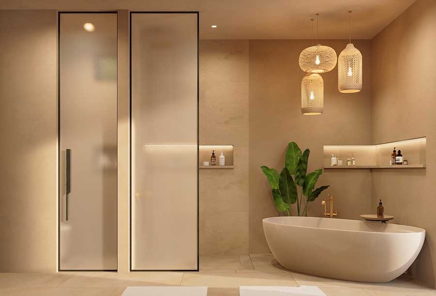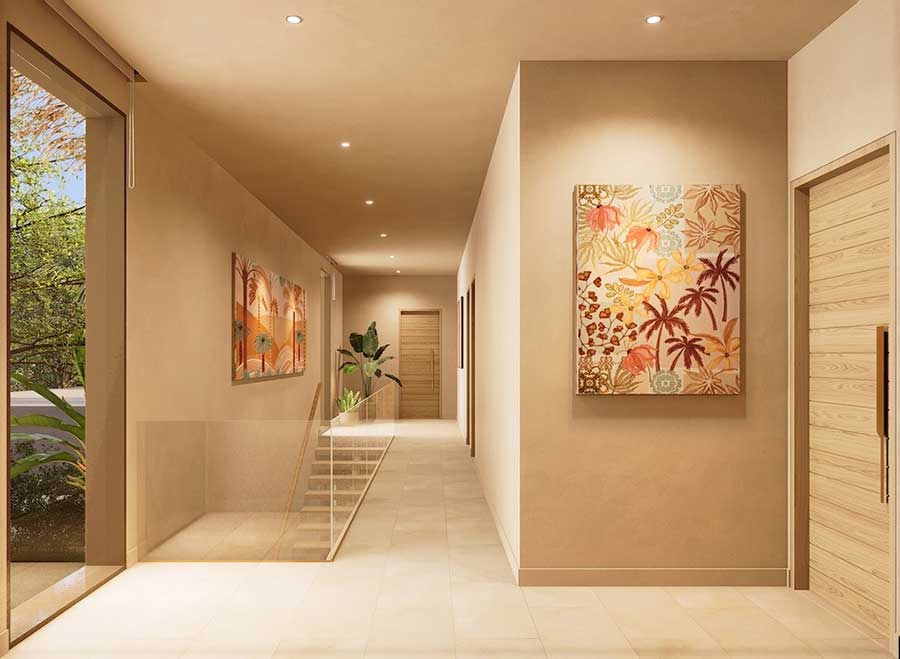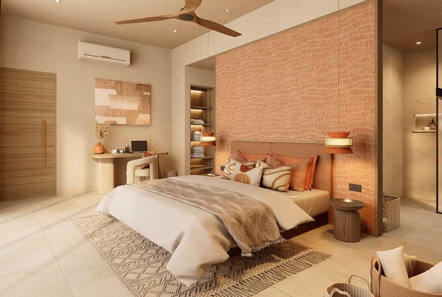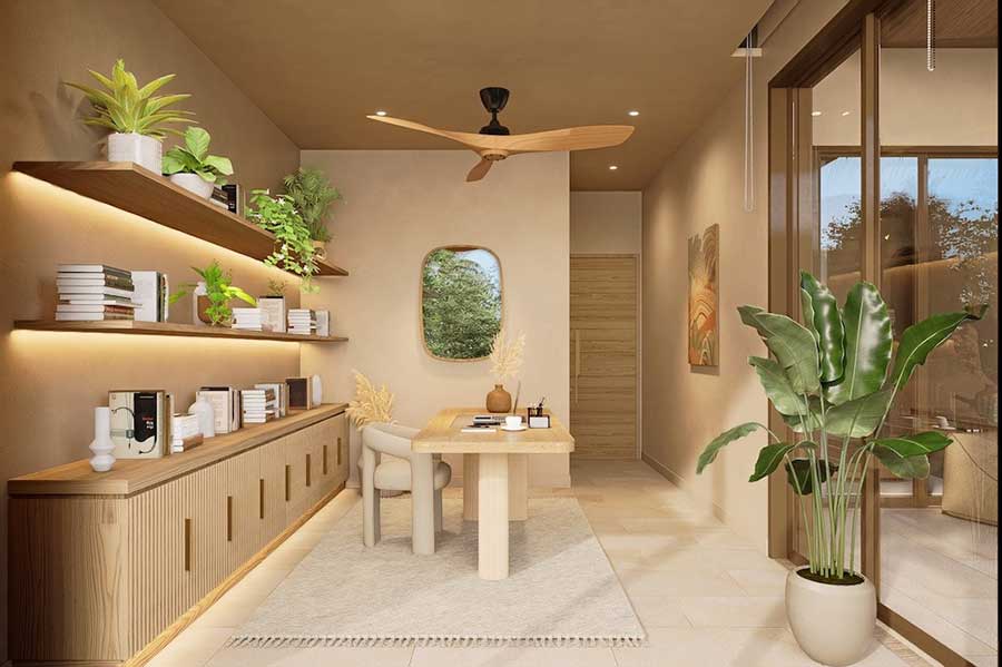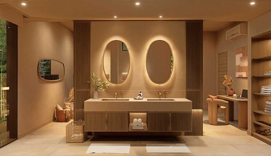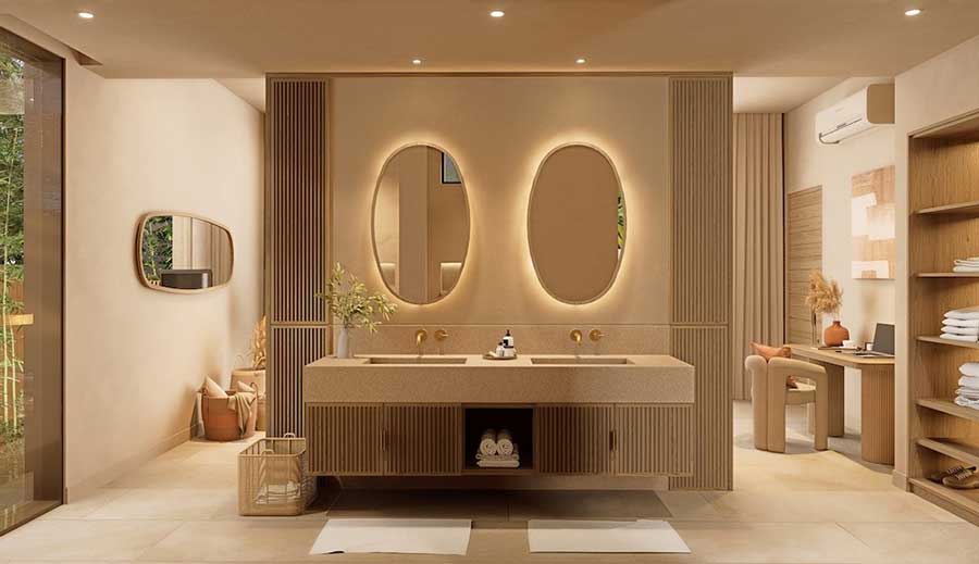 Each villa is arranged with four en-suite bedrooms and a total of six bathrooms, with the option to configure the layout as four bedrooms plus a private office or five bedrooms, as outlined in the project material. The villas are designed around open-plan living and dining areas that connect directly to the outdoor spaces, creating a practical layout suited to full-time living, holiday use, or long-term rental.