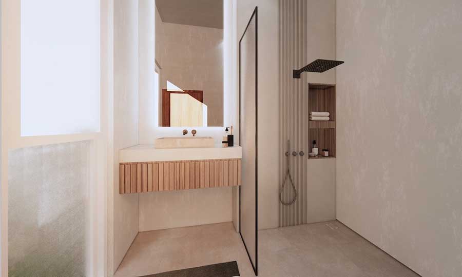 The villa’s design follows a single-level layout centred around a private 32 sqm swimming pool and 75 sqm garden. The entrance leads through a 24 sqm parking area into a 26.5 sqm open-plan living and kitchen space, opening onto a shaded 38 sqm patio for dining and relaxation.