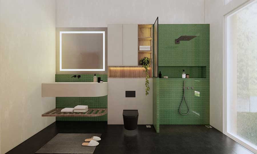 The master suite, positioned at the front, overlooks the pool and includes an en-suite bathroom. Two additional bedrooms, each with en-suite bathrooms, sit on either side of the layout, maintaining privacy while preserving easy access to shared spaces. A guest toilet completes the interior plan. The configuration ensures all principal rooms open toward the pool and garden, creating a strong indoor–outdoor connection characteristic of tropical architecture.