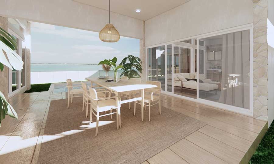The layout has been carefully planned to enhance both practicality and relaxation, with light-filled interiors and outdoor spaces designed for year-round enjoyment. The open-plan living and dining area connects directly to the covered patio and pool terrace, encouraging natural airflow and strong visual links to the surrounding greenery and coastline.