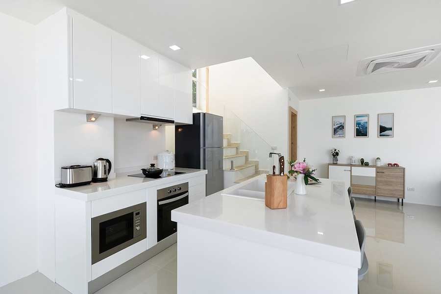 The villa spans 300 sqm of living space on a 288 sqm land plot, arranged over two floors. The open-plan main level includes a bright living and dining area framed by floor-to-ceiling glass doors that open directly to a large sun terrace and infinity-edge pool. The modern Western kitchen features premium appliances, including an oven, gas hob, microwave, and refrigerator, with ample cabinetry and sleek finishes that complement the villa’s minimalist aesthetic.