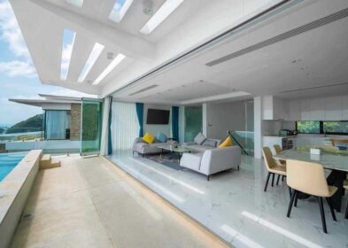 The property features an expansive open-concept living area with floor-to-ceiling glass doors that frame the views and allow natural light to flood the interiors. These full-height doors lead directly to the private infinity-edge pool, surrounded by a spacious pool deck and manicured lawn. An adjacent al fresco dining area offers an ideal space for outdoor entertaining while enjoying the villa’s tranquil atmosphere.