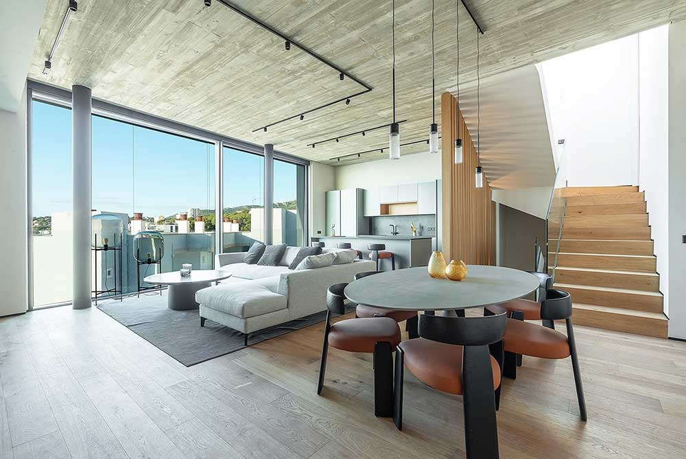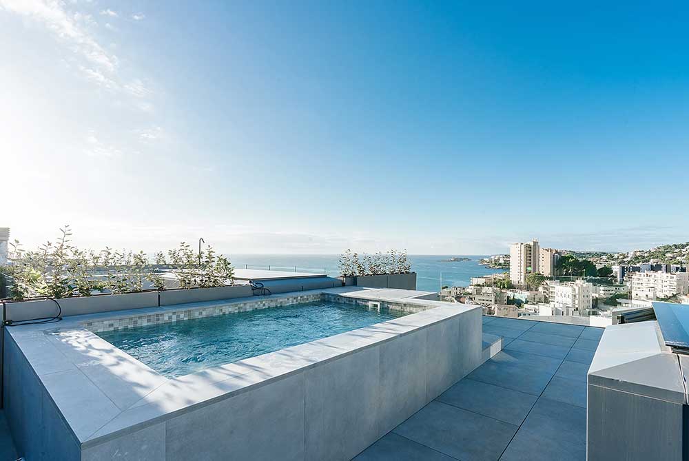 The featured unit is a duplex penthouse of 223 sqm with a total of 95 sqm of terraces. A highlight is the private 10 sqm rooftop pool, set on a spacious terrace with room for dining, lounging and sunbathing while enjoying sea views.