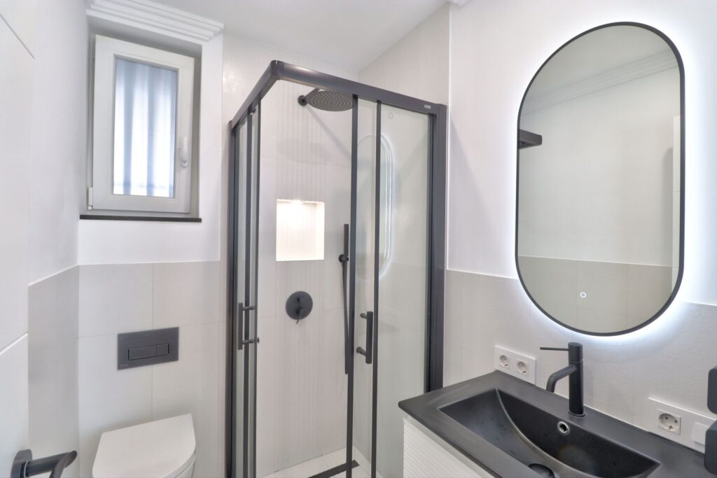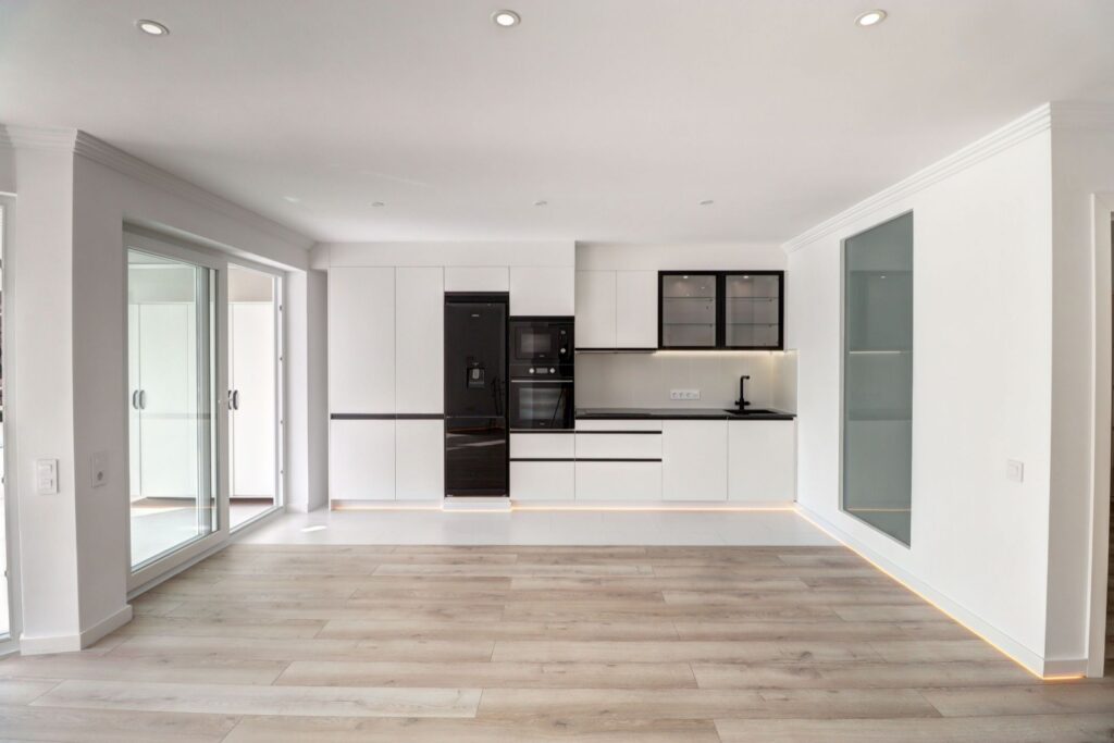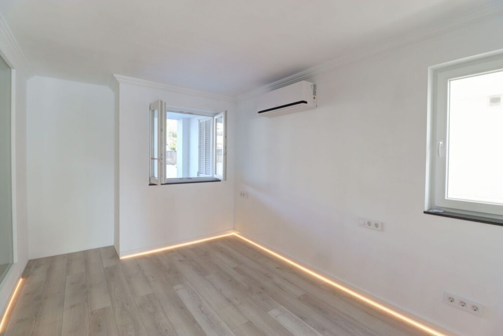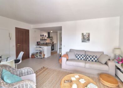 The apartment provides approximately 86 sqm of living space and has been thoughtfully modernised to create a bright and welcoming interior. The open layout includes a comfortable living and dining area with contemporary finishes, a modern fitted kitchen, two elegant bathrooms, and two peaceful bedrooms designed for year-round comfort. Integrated air conditioning ensures a pleasant environment in all seasons.