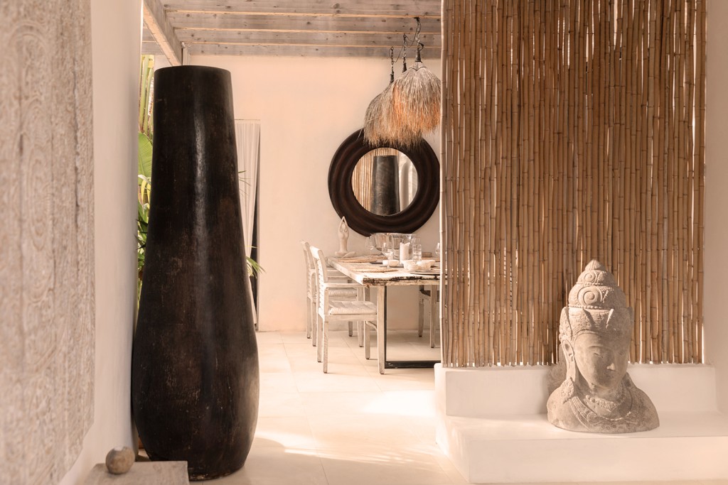 The interior features high ceilings and strong natural light, with design influences that emphasise open space and calm, functional living. The central Mediterranean-style courtyard includes planting, a water feature, and an outdoor shower, creating a usable outdoor area that connects the different parts of the home.