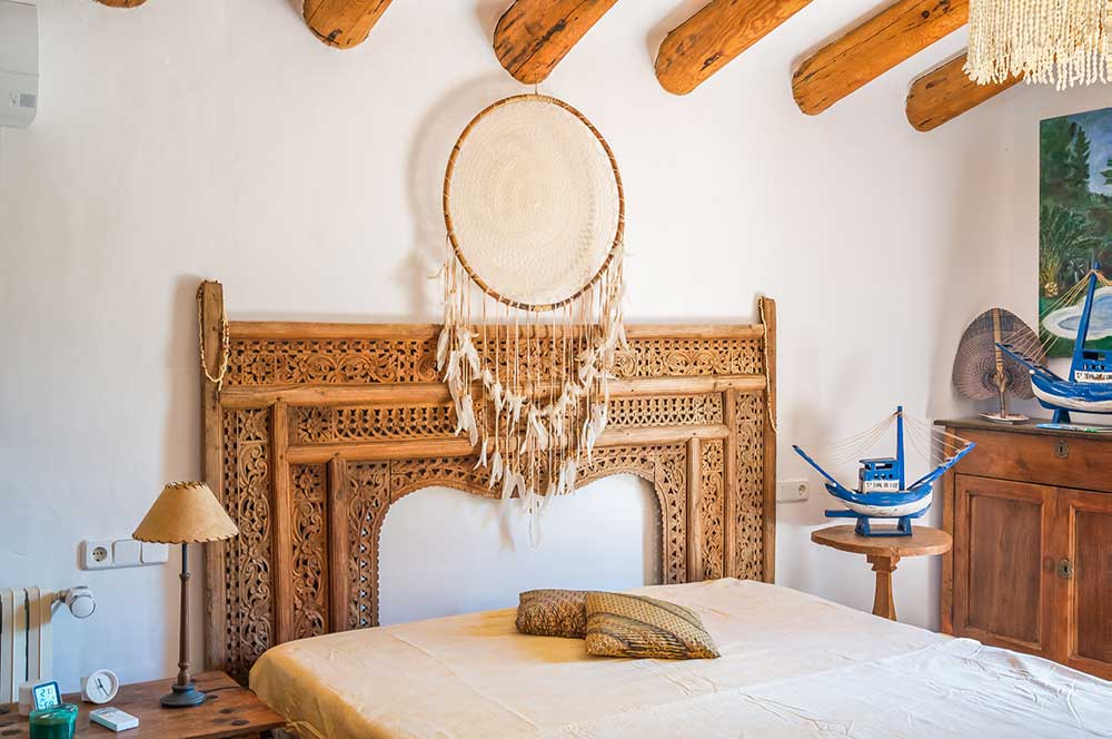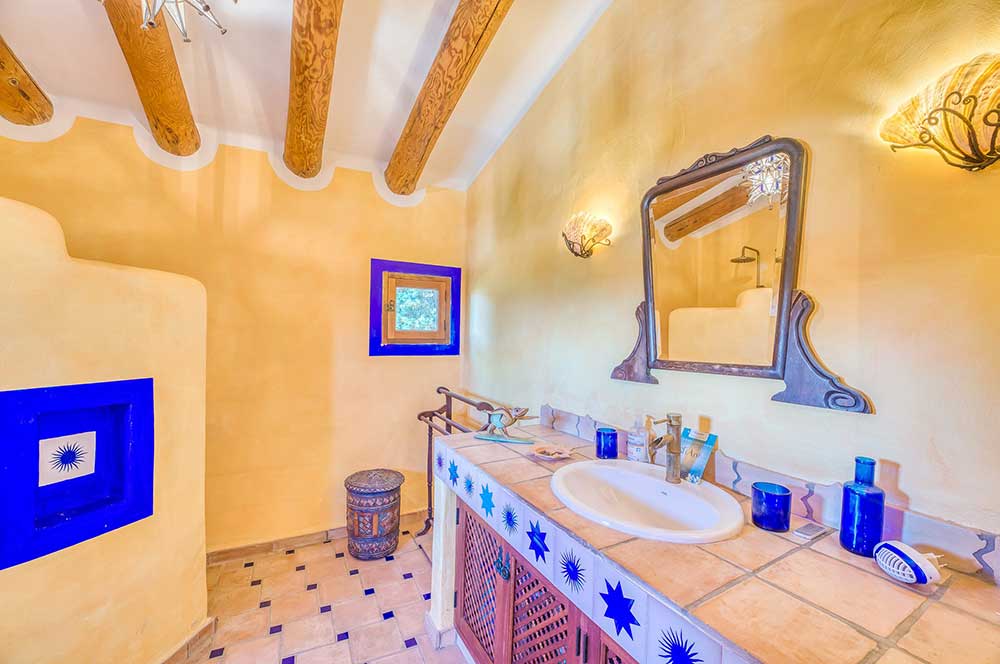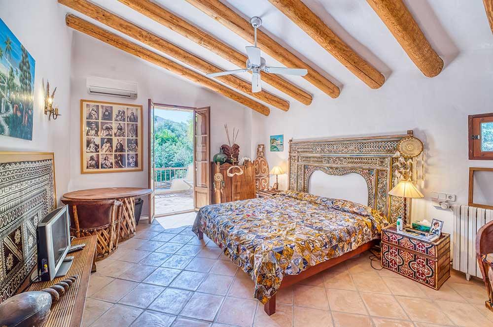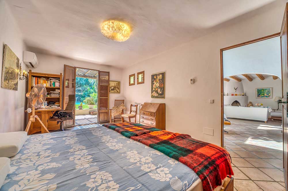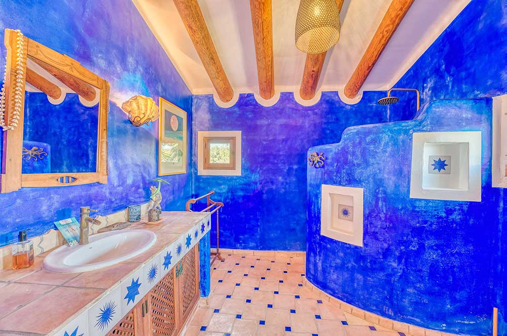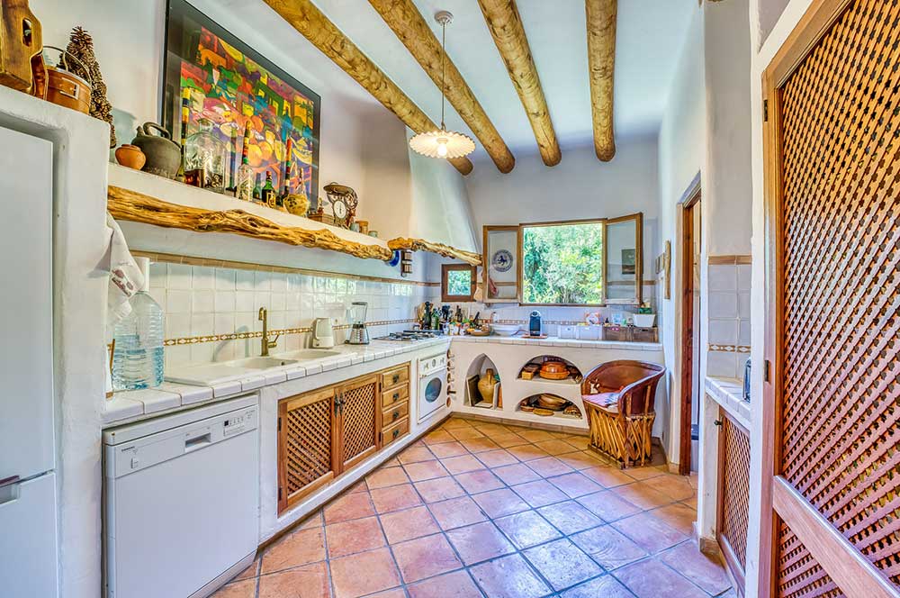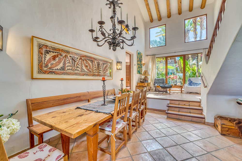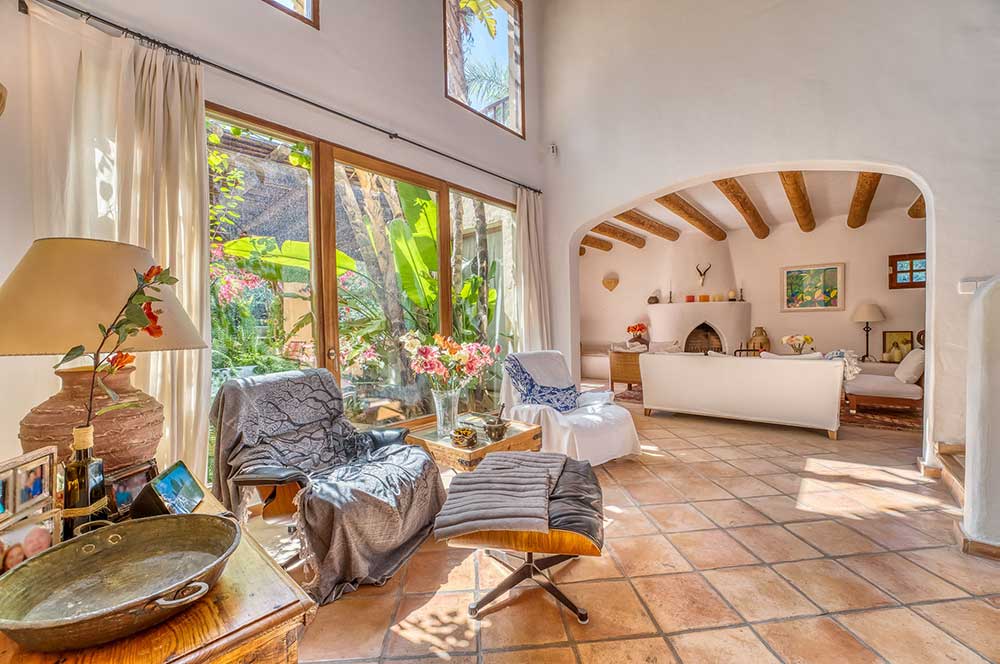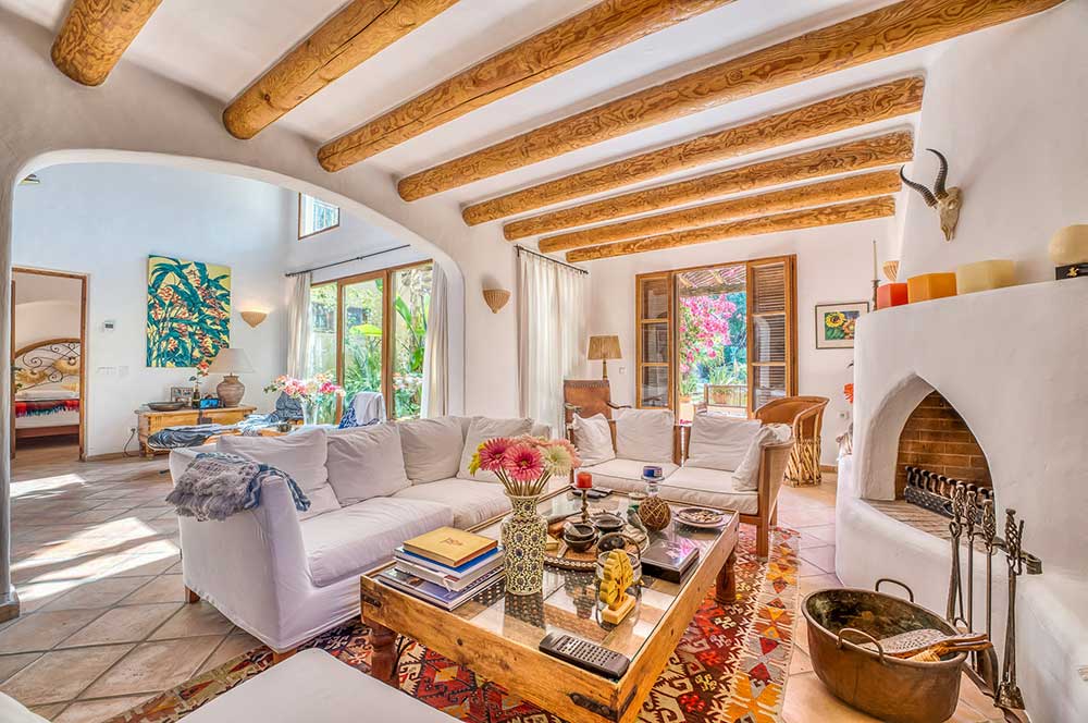 Unique elements define the villa’s character. Antique wooden doors from historic Mallorcan properties, rounded wooden beams sourced from Catalonia, and a fireplace styled with Ibiza-Mexican influence all stand out. The floors are finished with carefully laid, hand-made terracotta tiles, adding texture and warmth throughout.