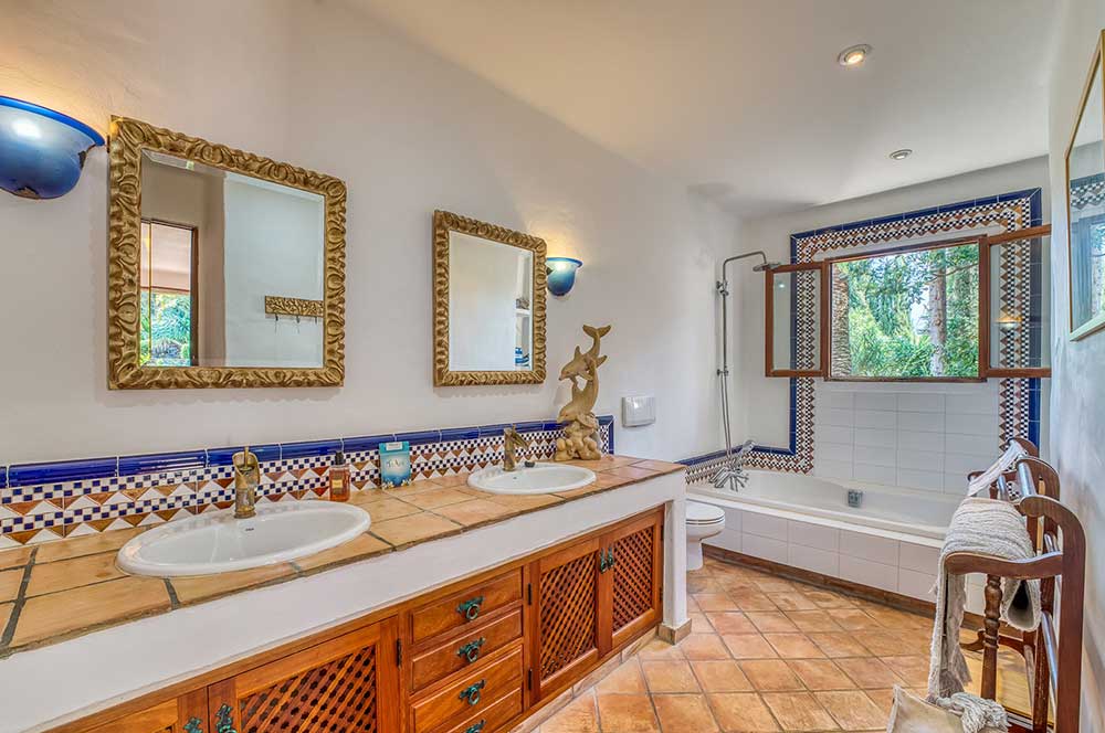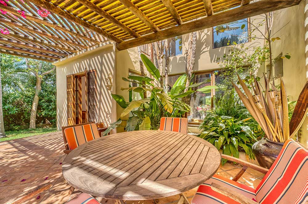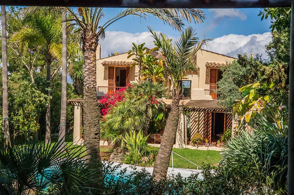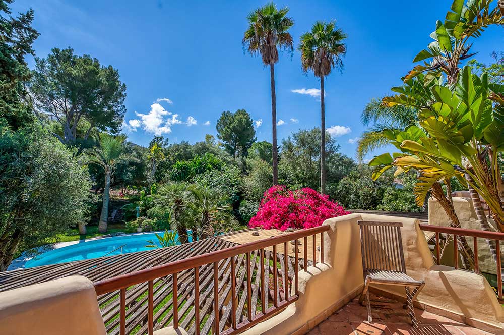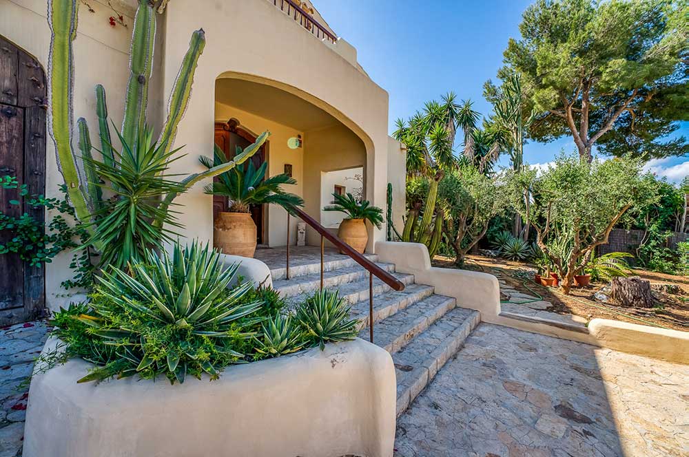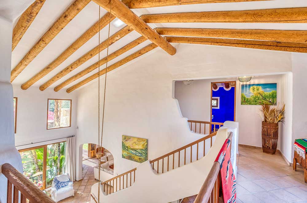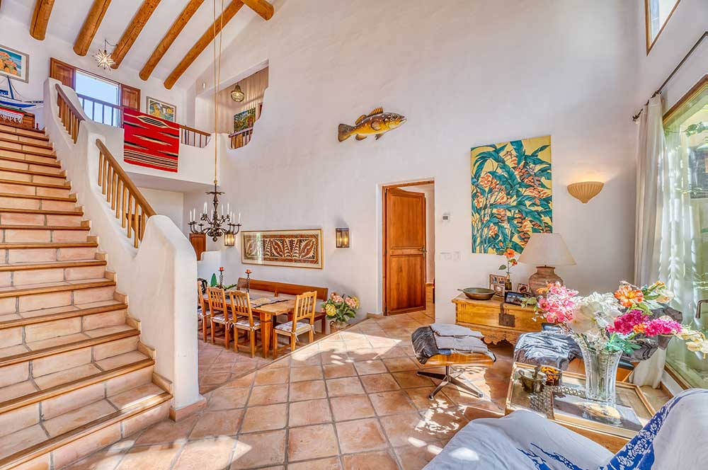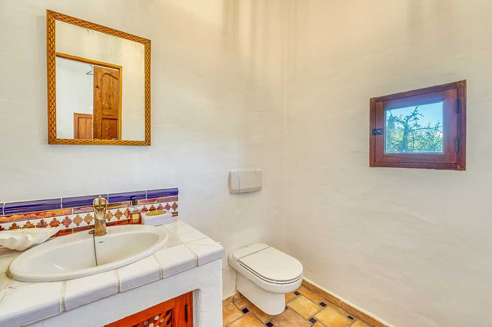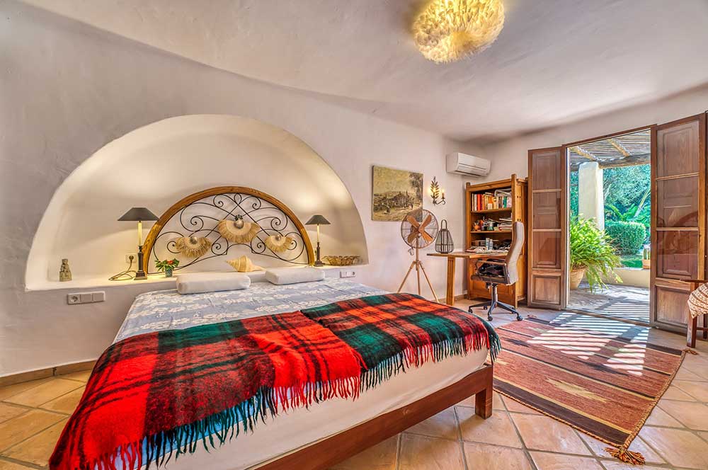 Unique elements define the villa’s character. Antique wooden doors from historic Mallorcan properties, rounded wooden beams sourced from Catalonia, and a fireplace styled with Ibiza-Mexican influence all stand out. The floors are finished with carefully laid, hand-made terracotta tiles, adding texture and warmth throughout.