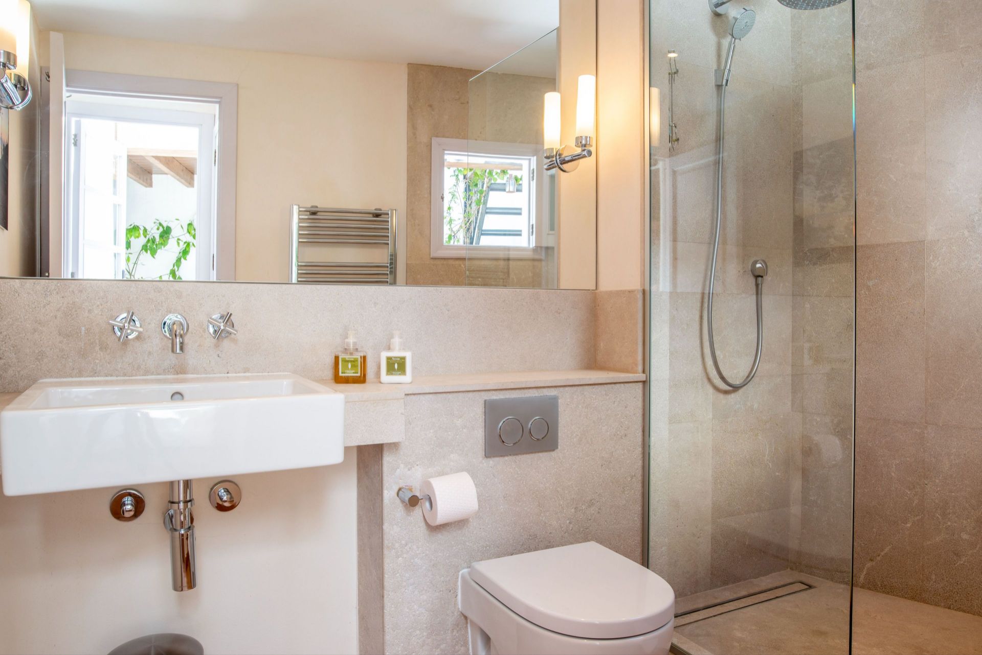 Two terraces provide additional outdoor areas. The roof terrace in particular offers sweeping views across Pollensa’s rooftops, the Puig de Maria and surrounding countryside, with distant glimpses of the sea.