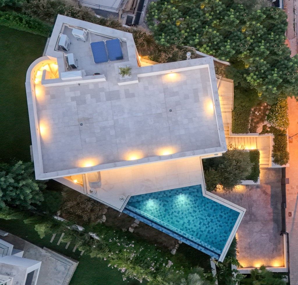 Large sliding doors open onto a sunny terrace with an infinity pool and partial sea views. Behind the kitchen lies a flat landscaped garden — ideal for children or pets — while a staircase leads to the rooftop terrace with panoramic coastal views.