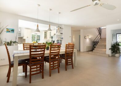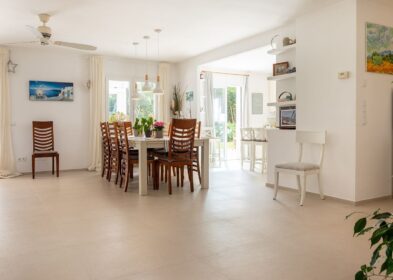 The internal layout includes approximately 244 sqm of living space, arranged to maximise natural light throughout the main rooms. The villa is configured with four bedrooms and three bathrooms, supporting both family use and longer stays. The overall distribution of space is designed to create a functional flow between living and sleeping areas without unnecessary segmentation.
