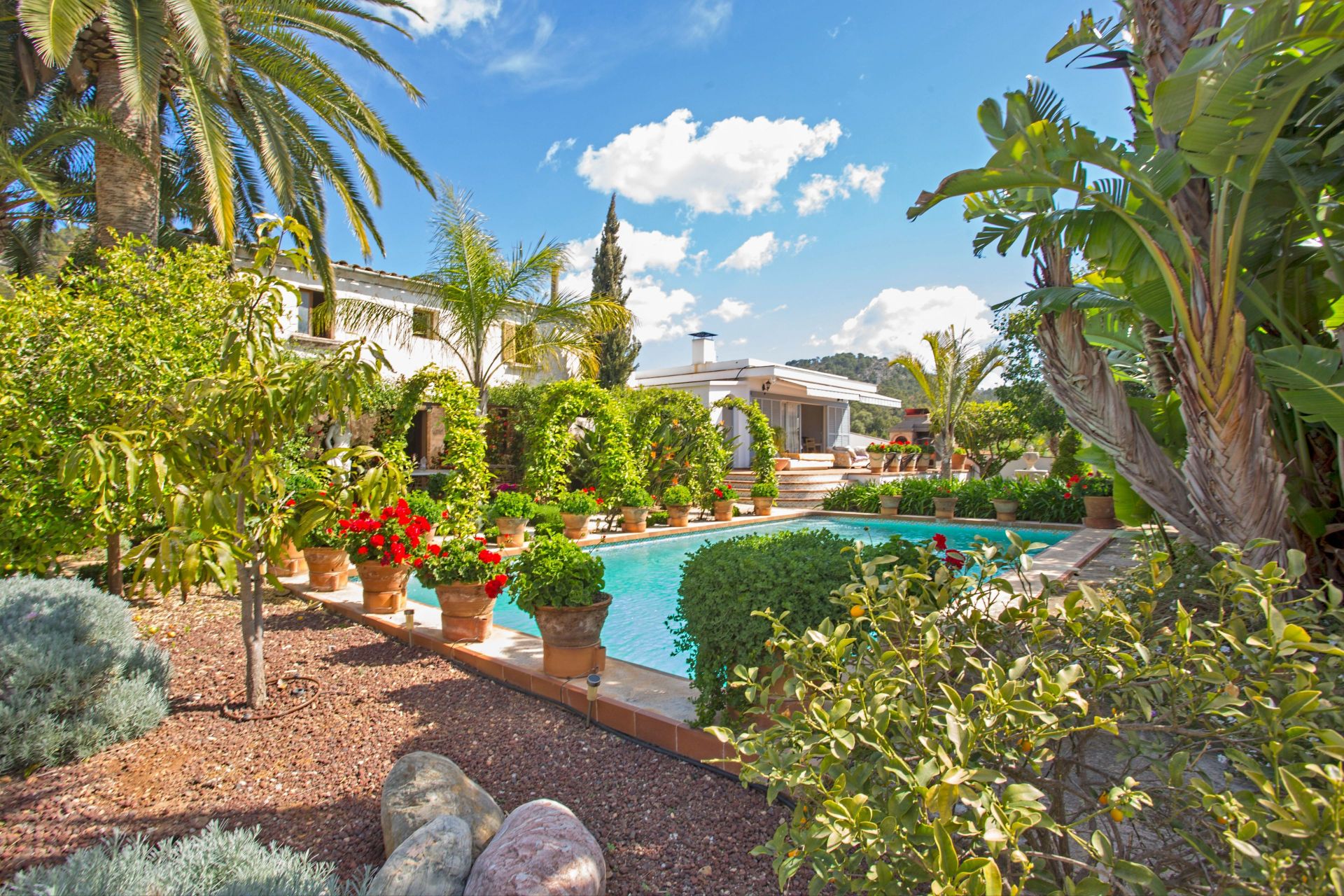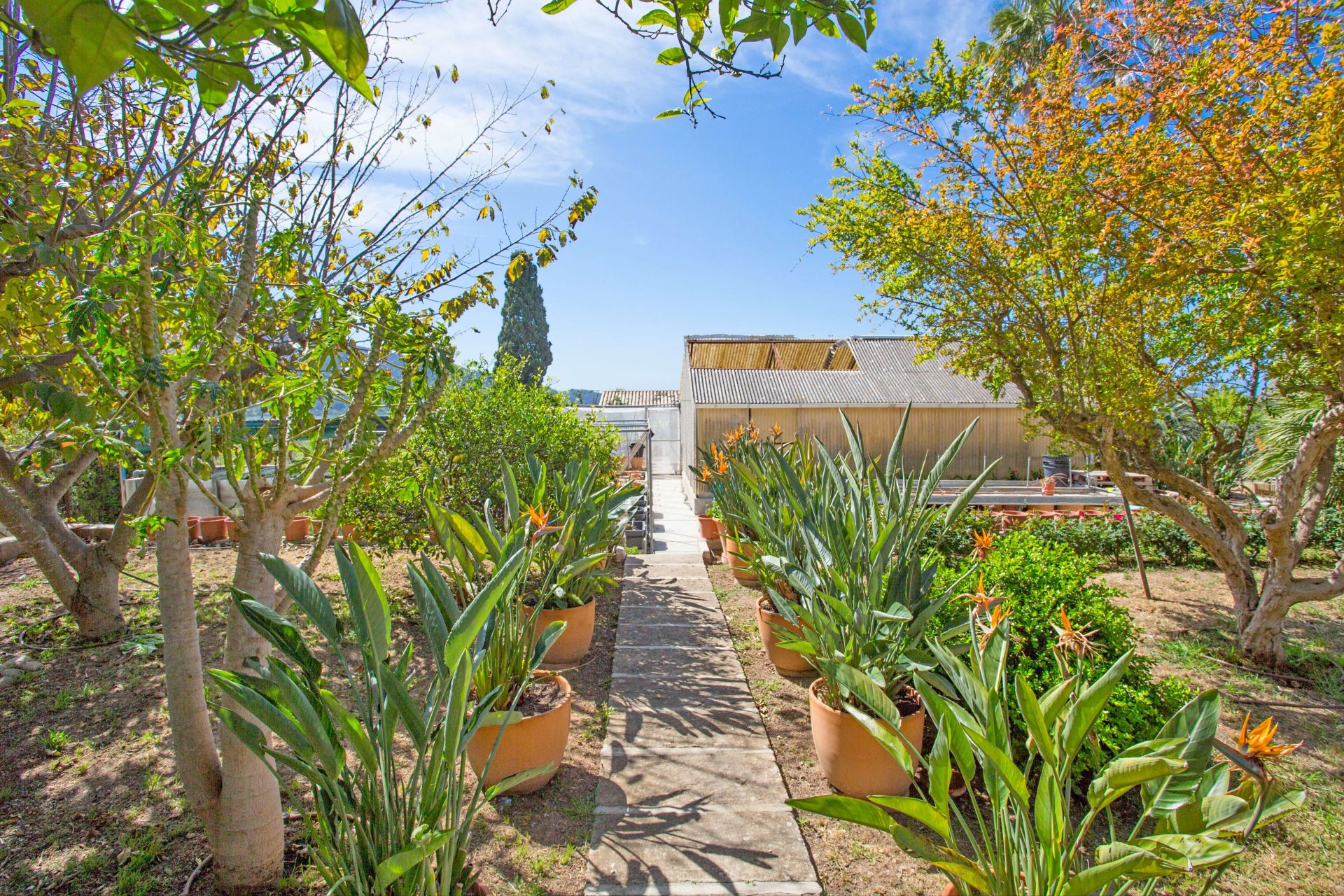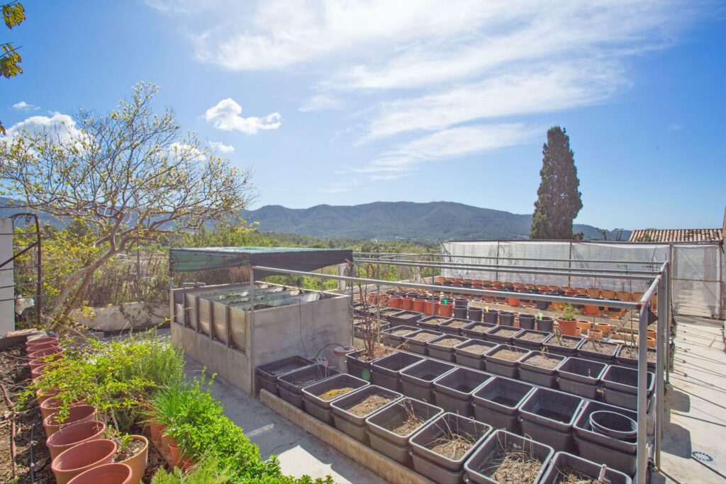 The outdoor environment is one of the standout aspects of the property. The pool area is framed by established greenery and open mountain views, giving the garden a quiet and private atmosphere. Toward the rear of the plot sit two central storage buildings, and beyond these lies a sizeable agricultural zone that includes a greenhouse. Multiple access points extend from the main entrance, including a gated route that leads to a covered parking area with space for two vehicles.
