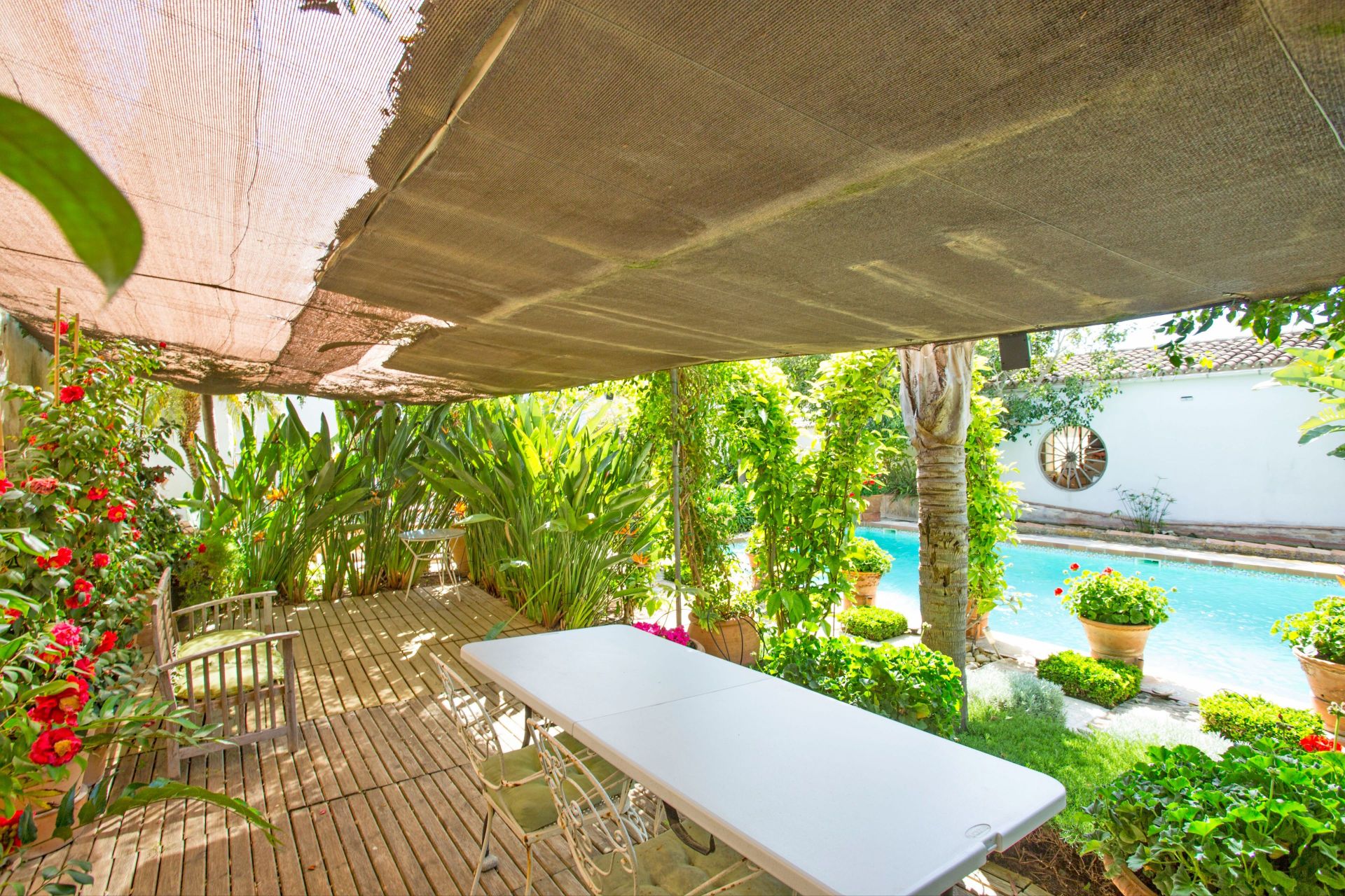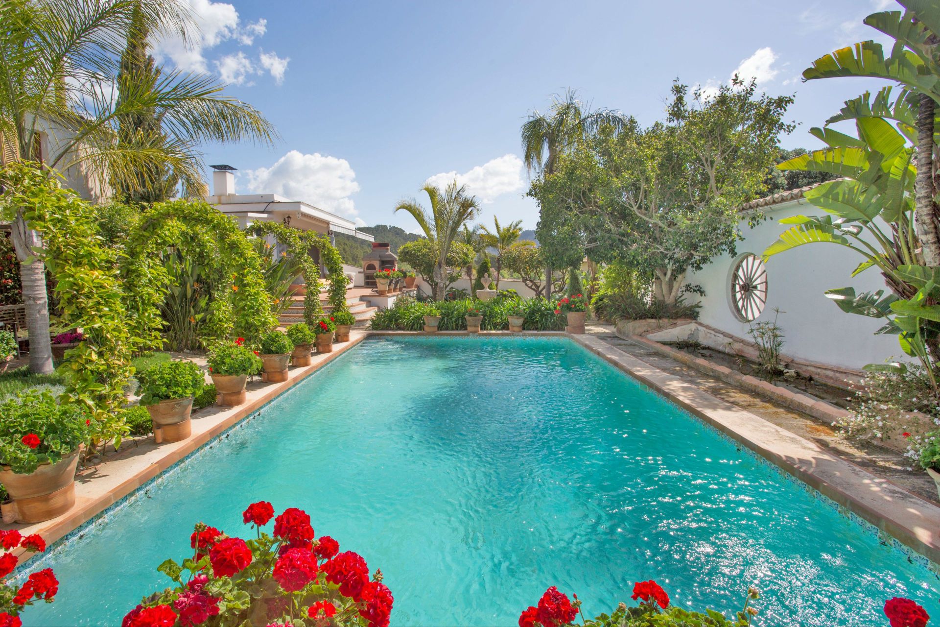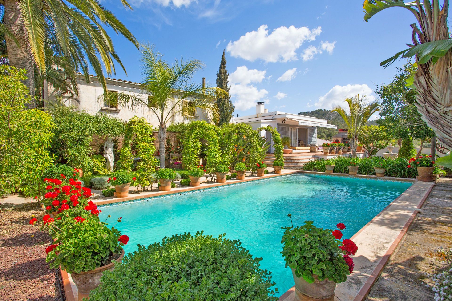The outdoor environment is one of the standout aspects of the property. The pool area is framed by established greenery and open mountain views, giving the garden a quiet and private atmosphere. Toward the rear of the plot sit two central storage buildings, and beyond these lies a sizeable agricultural zone that includes a greenhouse. Multiple access points extend from the main entrance, including a gated route that leads to a covered parking area with space for two vehicles.