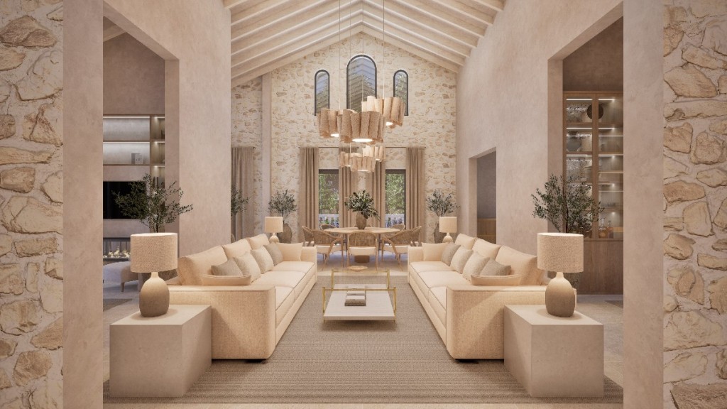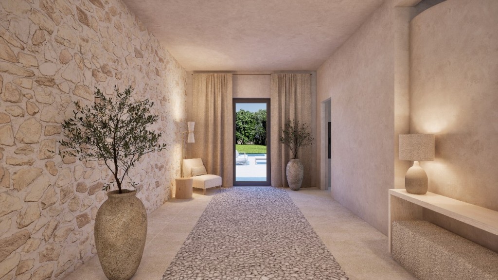 The residence combines traditional Majorcan character with a high specification finish, integrating landscaped gardens and its own private woodland to create a secluded coastal estate. The design centres on open, elegant living spaces, natural materials and a neutral interior palette, intended to connect interior and exterior areas seamlessly.