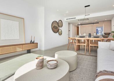 The property includes a 60 sqm private garden and a 30 sqm covered terrace, providing ample outdoor living space for dining or relaxation. The apartment opens into a bright open-plan living area with modern finishes throughout, including a contemporary kitchen.