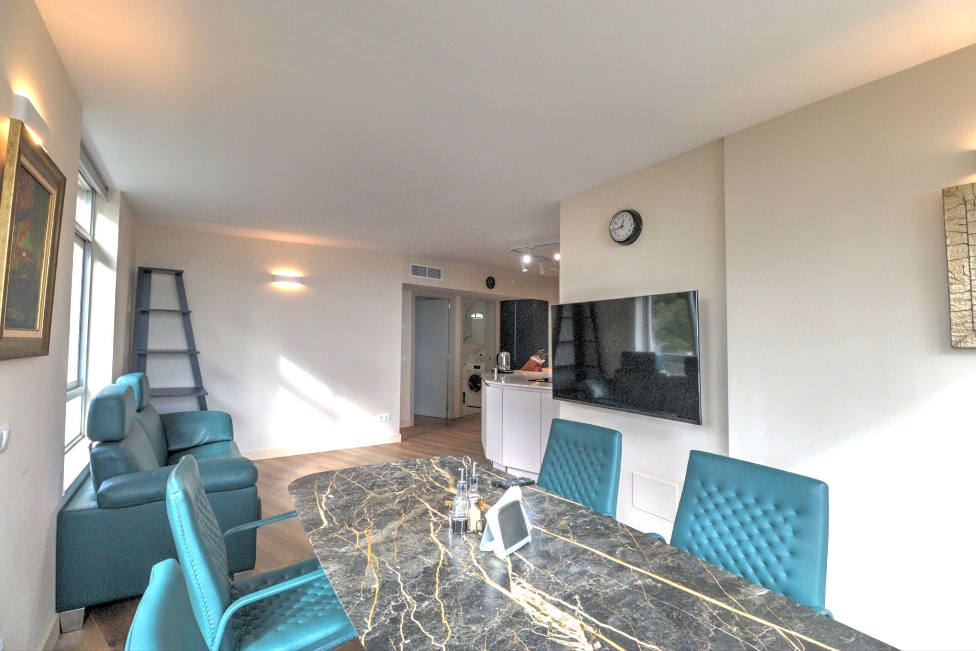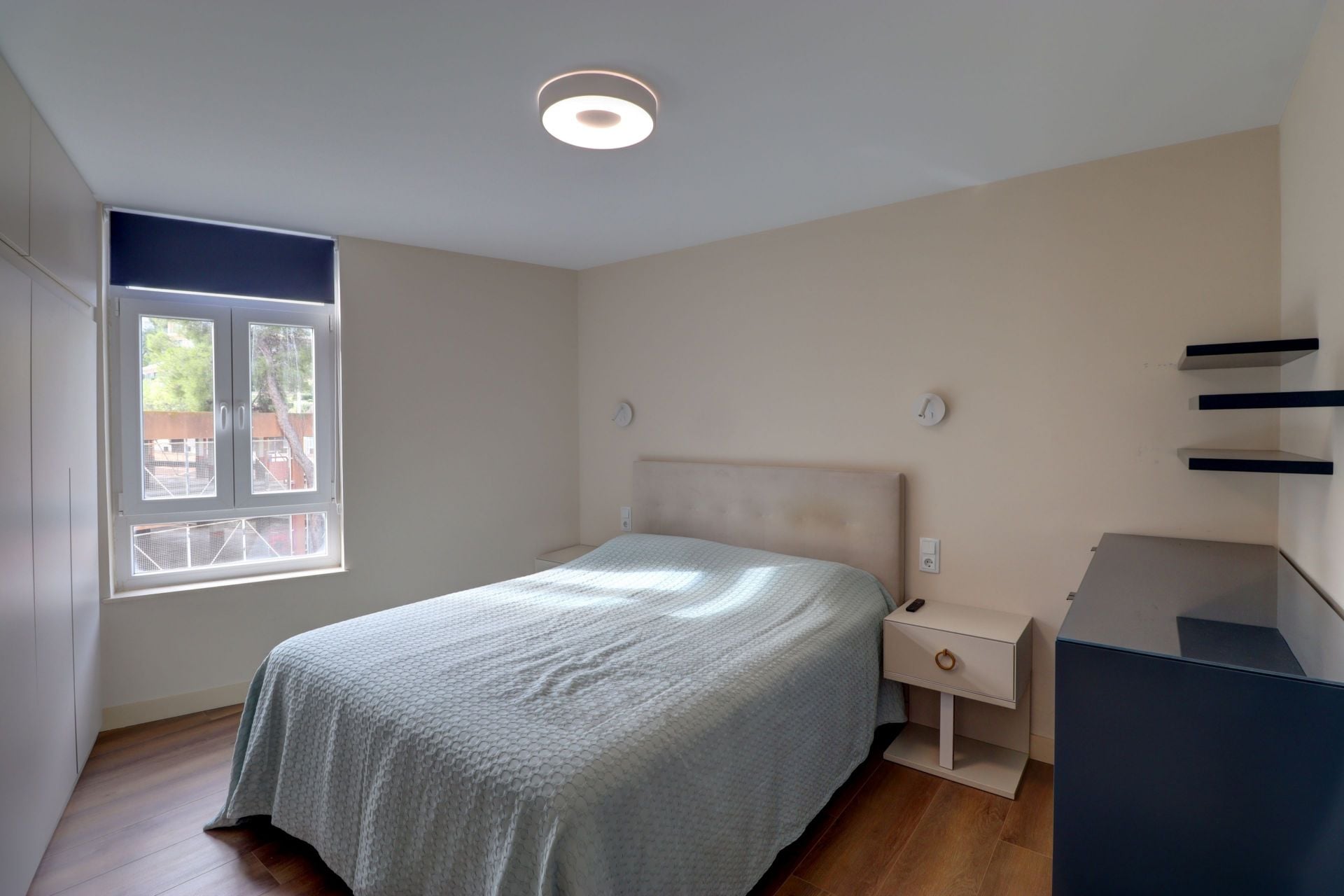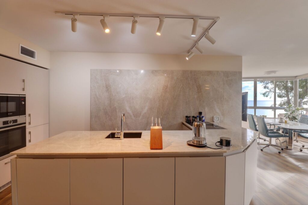 The apartment comprises two bedrooms and one generously sized bathroom, all refurbished to a high standard using quality materials and a restrained, considered design approach. The interior presents a calm and well-balanced living environment, with sea views forming a constant visual backdrop to daily living. The refurbishment focuses on comfort and finish rather than decorative excess, resulting in a space that feels refined and practical.