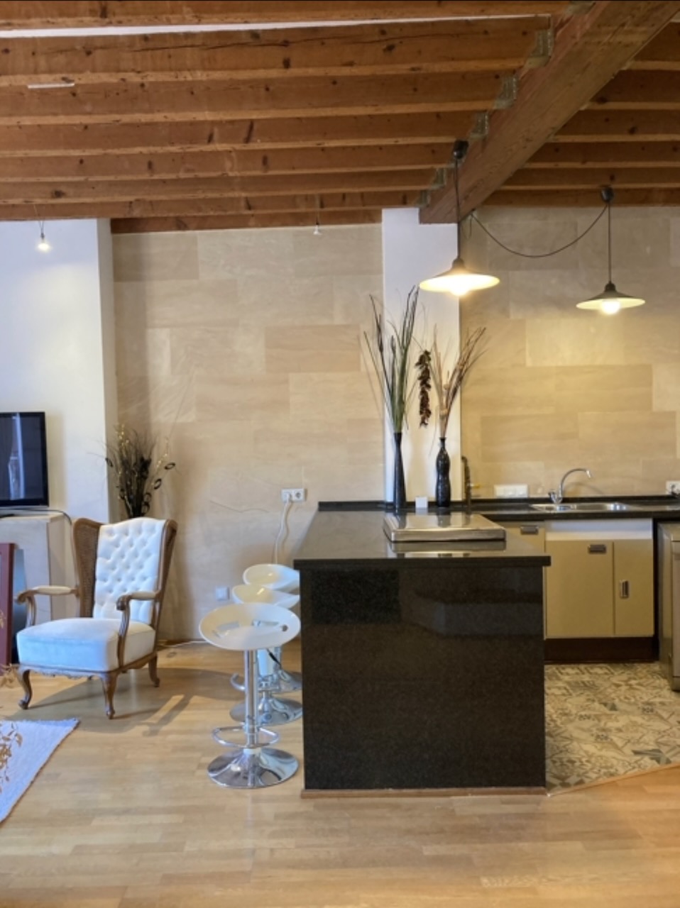 The living area is centred around a spacious open-plan layout that incorporates a fitted kitchen, dining space and lounge with fireplace. Large windows allow natural light to complement the warmth of the wooden beams and tiled flooring, preserving the apartment’s original style.