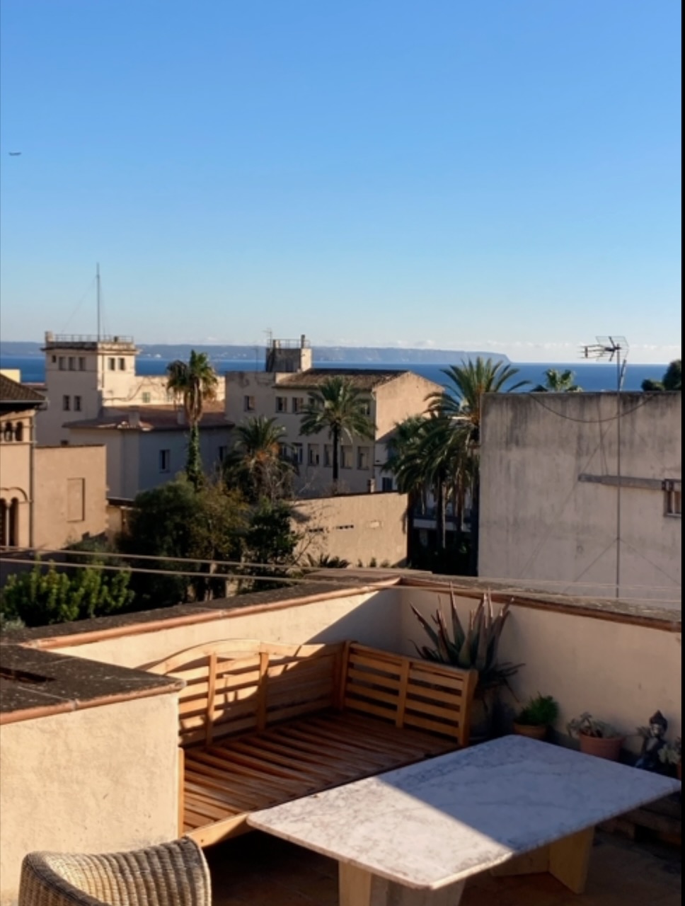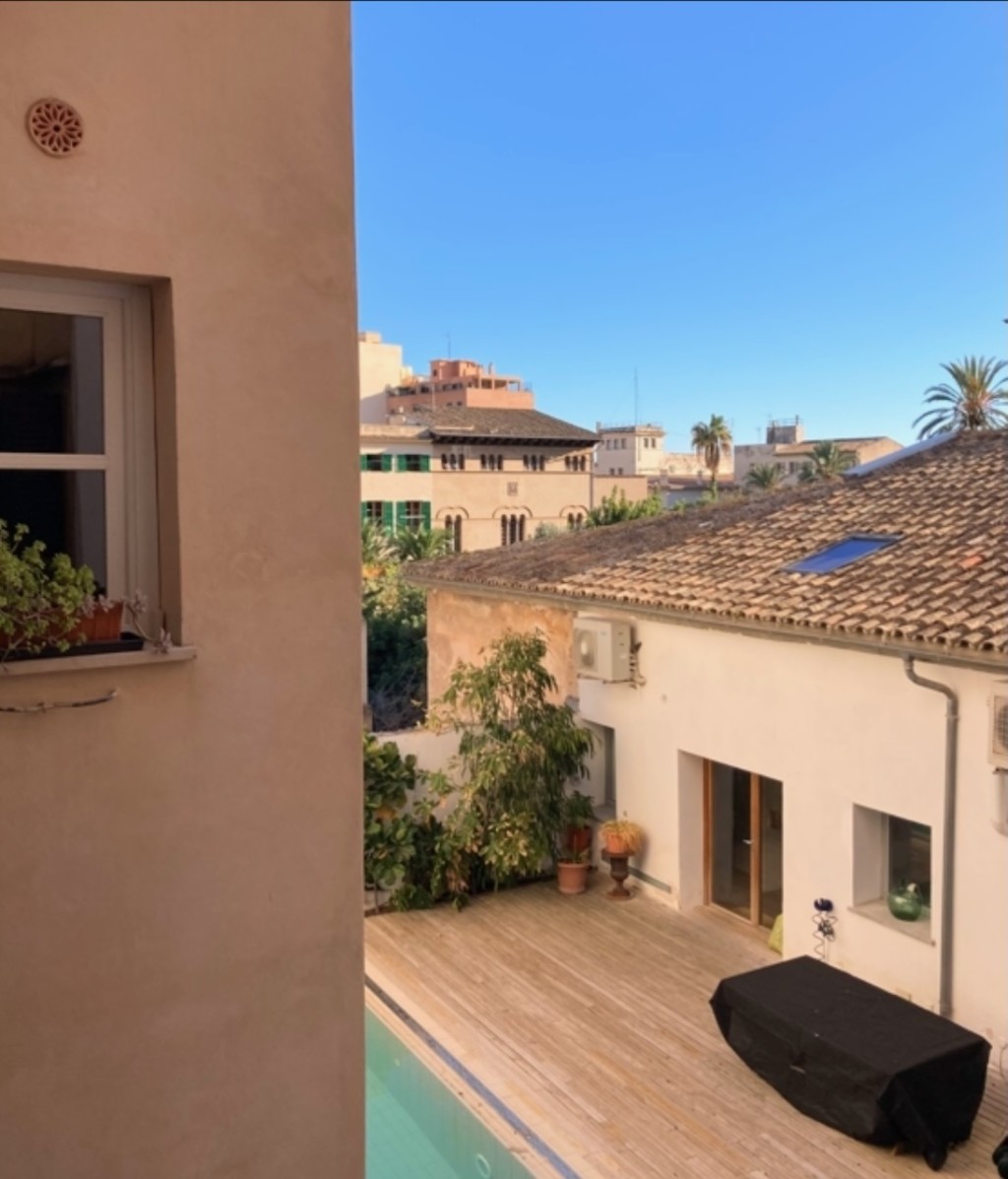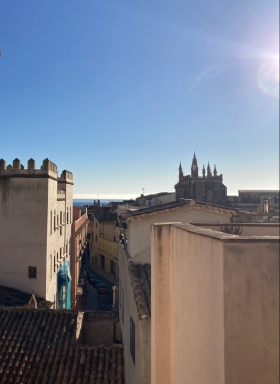 The property enjoys outlooks across the distinctive Plaza de la Palla, adding to the charm of its central setting. A shared roof terrace completes the home, offering open views across the rooftops and partial sea views towards the bay.