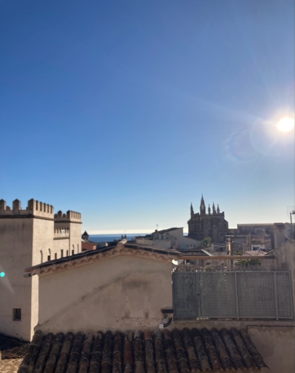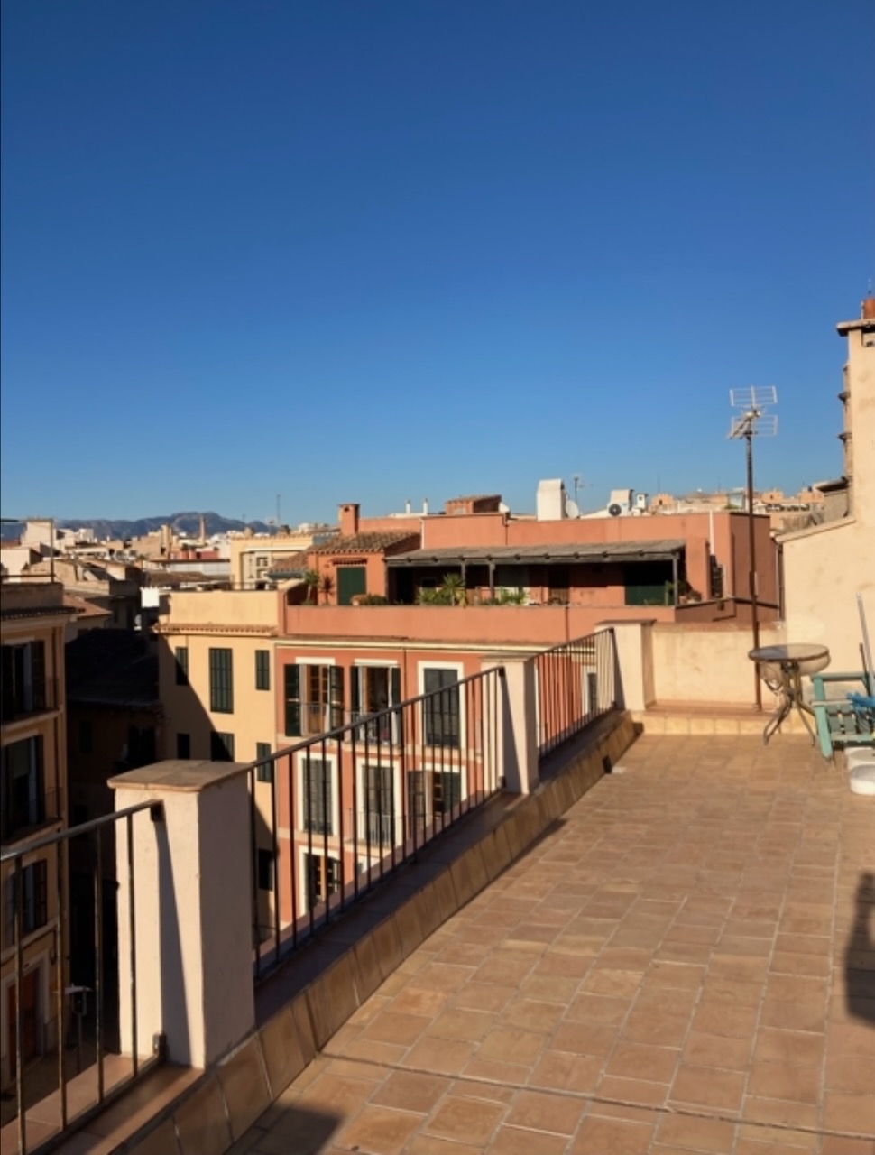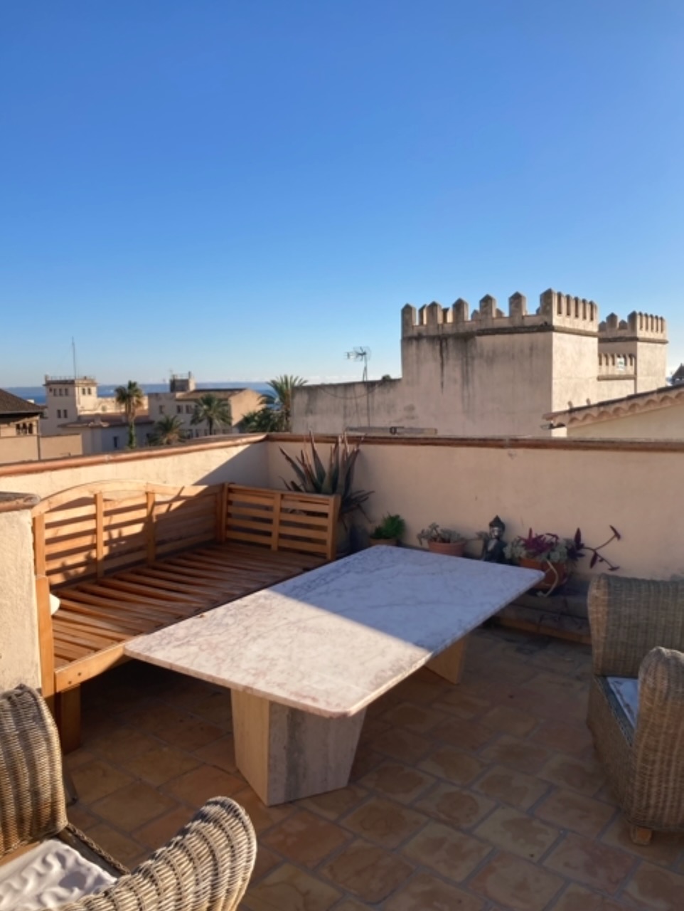 The property enjoys outlooks across the distinctive Plaza de la Palla, adding to the charm of its central setting. A shared roof terrace completes the home, offering open views across the rooftops and partial sea views towards the bay.