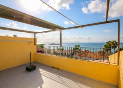 The villa spans three levels, each designed to capture natural light and the surrounding scenery. The main floor includes a comfortable living room with a fireplace and access to covered terraces that wrap around the home, offering open sea views. The fully equipped kitchen connects seamlessly to the dining area, creating a functional and social layout ideal for family gatherings.