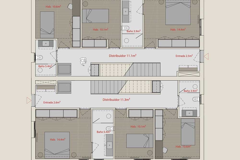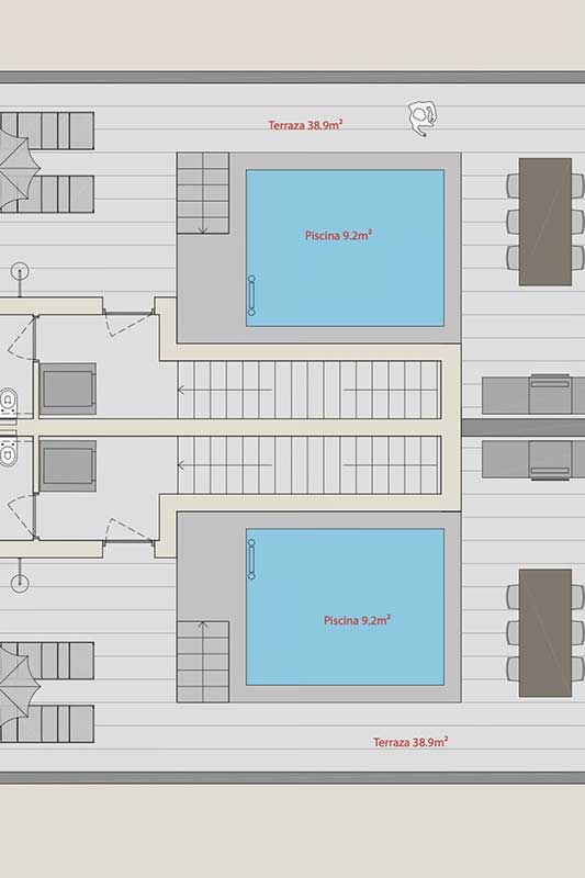 Each home includes a private garden, a ground-level pool, and two dedicated parking spaces. The highlight is the rooftop terrace with its own pool and panoramic sea views — a rare feature in this area and a strong focal point for outdoor living.