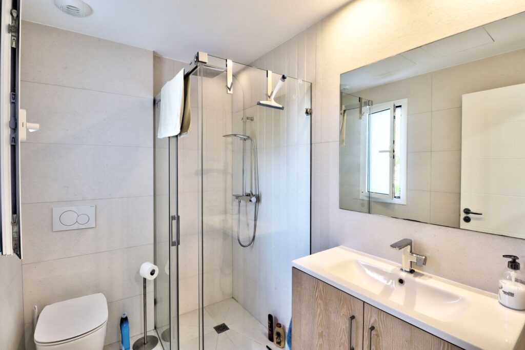 The interior spans 121 sqm, with a layout that flows naturally from the living area onto a 32 sqm covered terrace – a space that functions as a secondary living room for most of the year, benefiting from the south-west orientation and good afternoon and evening light. The kitchen and bathrooms have been updated with modern finishes in keeping with the clean, contemporary aesthetic of the development. Three bedrooms and two bathrooms make the proportions sensible for a full-time family residence or a high-end holiday home. Parking is well covered, with a private underground parking space and storage room included, plus two additional outdoor parking spaces.