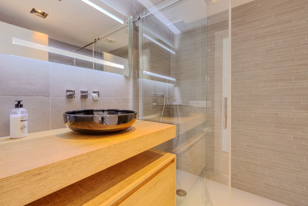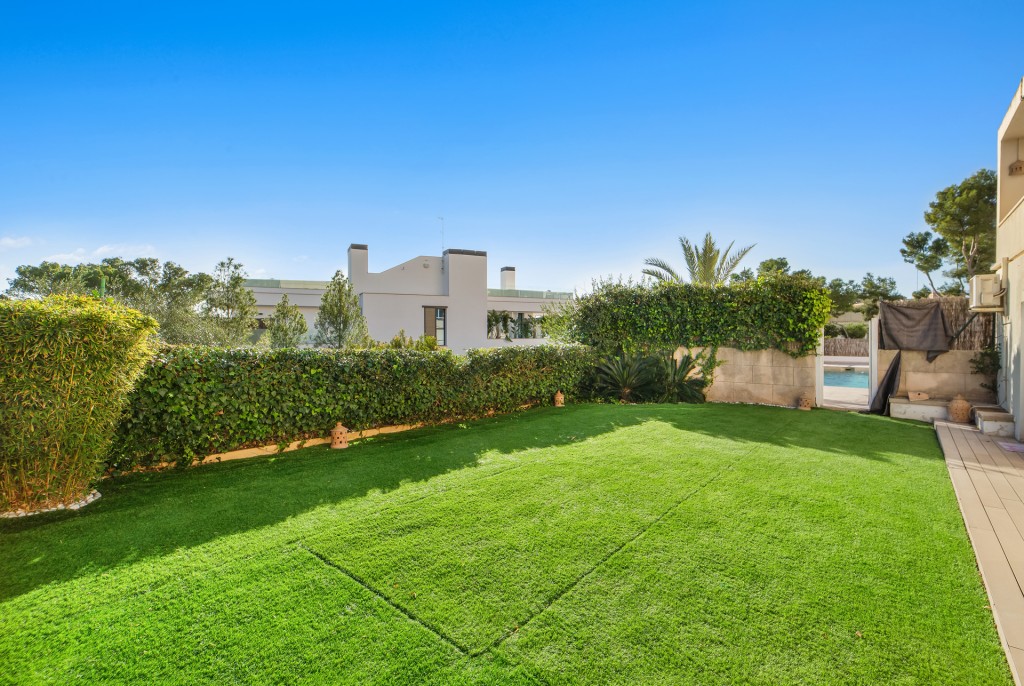 Outdoors, there’s a private garden with direct access to the communal pool and surrounding green areas. The terrace offers both covered and open seating areas for enjoying the views of the Bay of Palma.