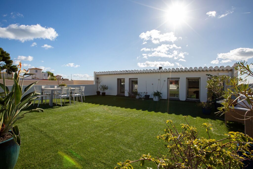 The upper-level master suite has sea views, shared by the large private roof terrace above – the standout feature of the property. According to the owner, the terrace is structurally suitable to potentially hold a pool, which would add a further dimension to what is already a strong outdoor space.