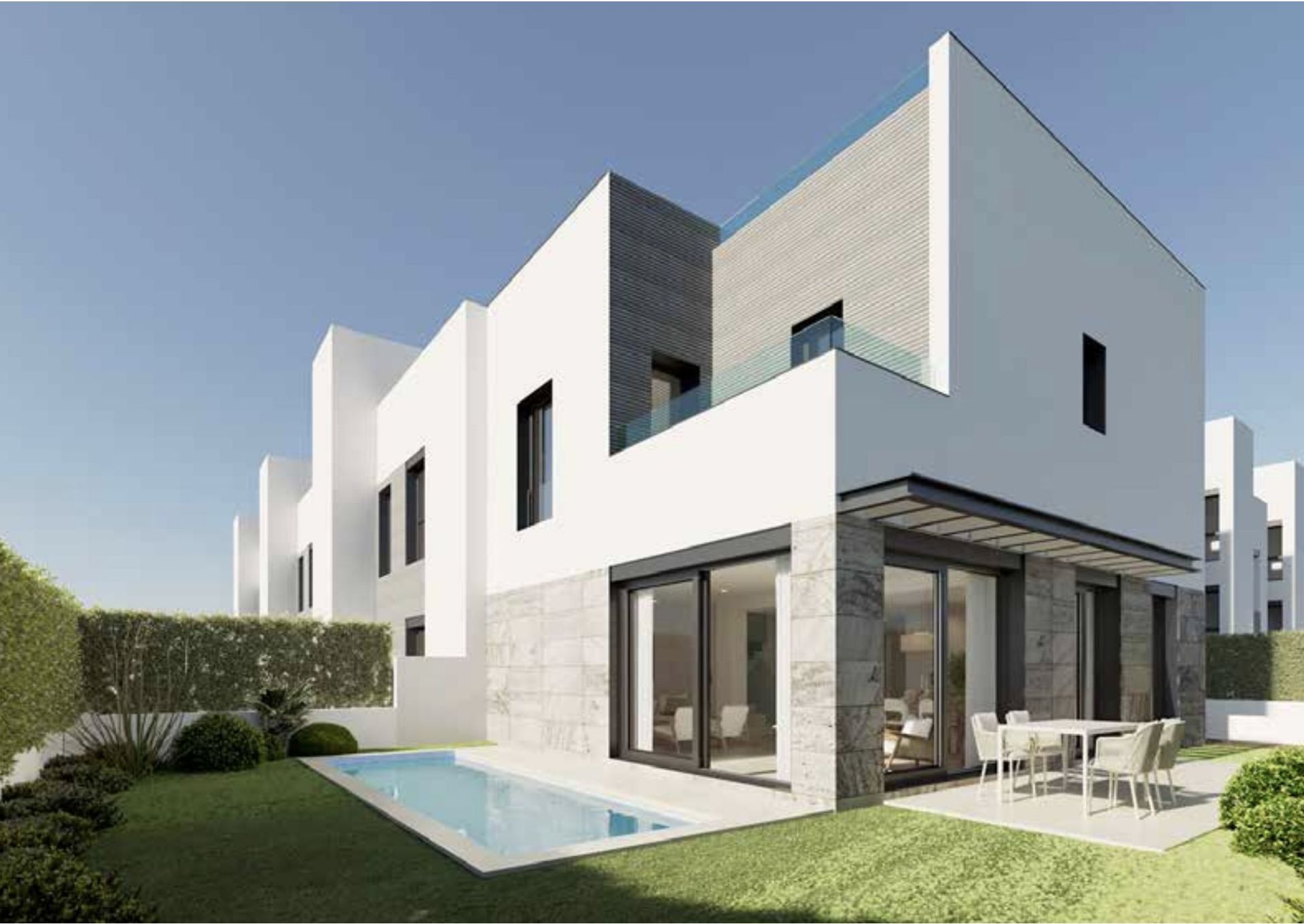 Outdoor areas include a private garden of up to 130 sqm, where a saltwater swimming pool is set into the landscaping for both privacy and comfort. A rooftop solarium extends the living space further, offering panoramic views and an ideal setting for entertaining. Double parking is provided at each villa for everyday convenience.