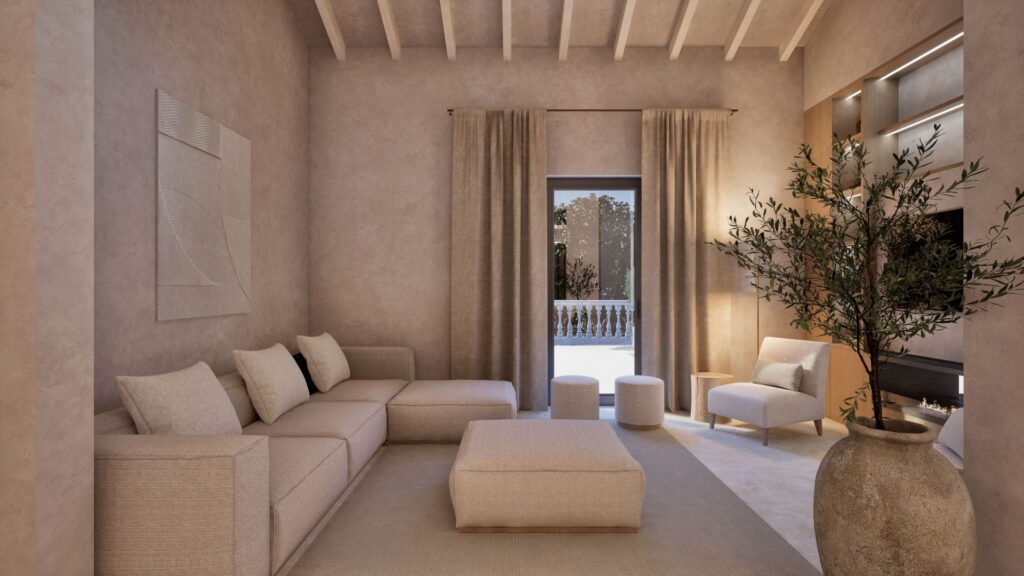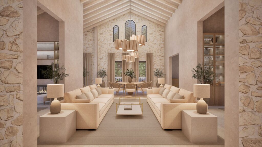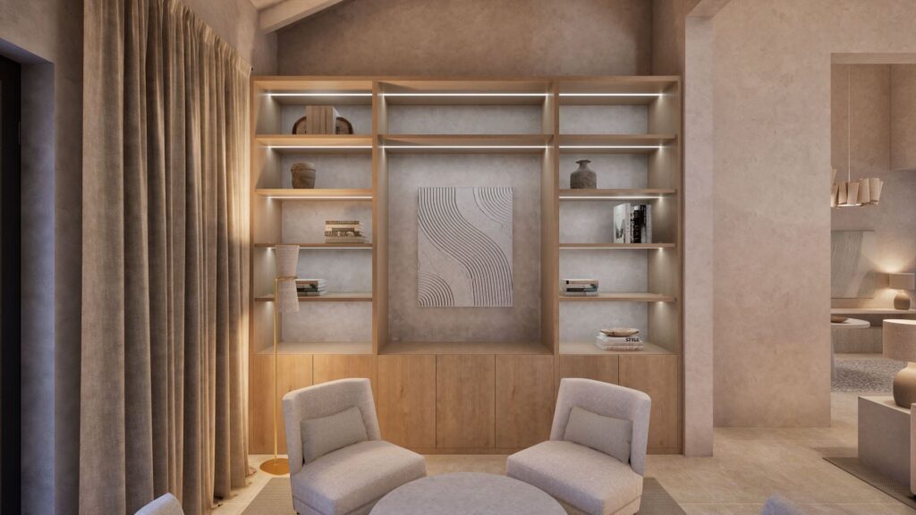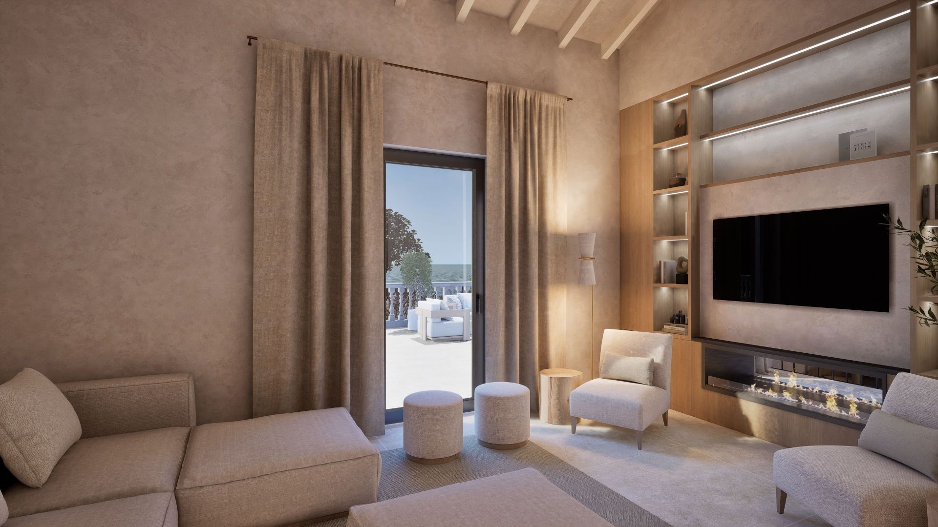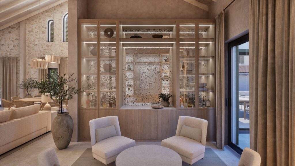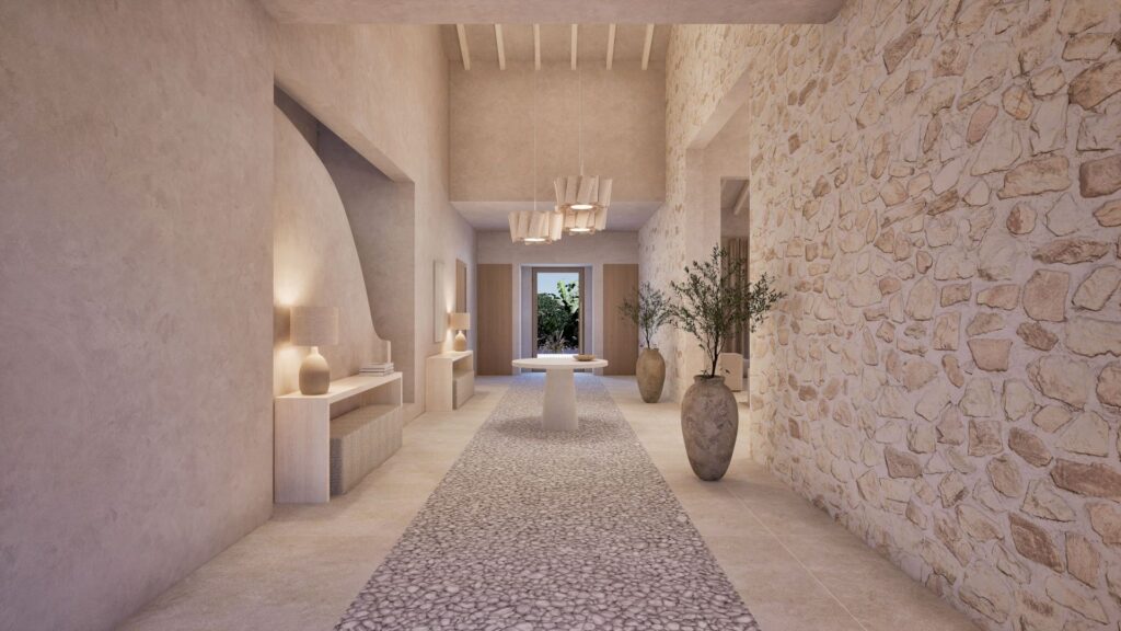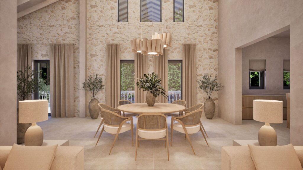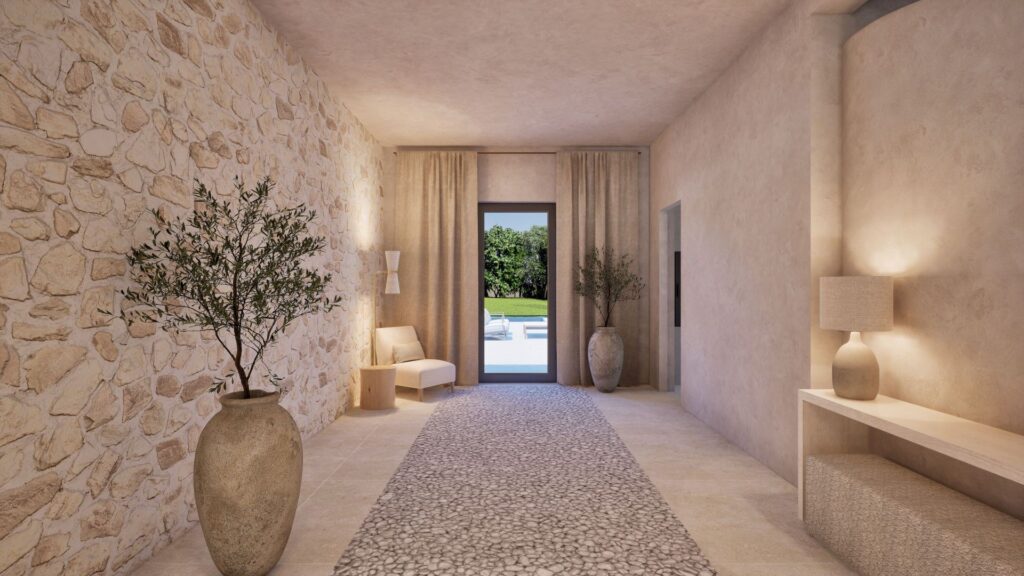 With a total build area of 546 sqm, the residence offers six spacious bedrooms, each with an en-suite bathroom. The master suite includes a dressing room, stone-finished bathroom and a private terrace with far-reaching views across Formentor Bay and Cap de Formentor. The main living area features vaulted ceilings with exposed stonework and a double-sided fireplace that connects to a secondary lounge.