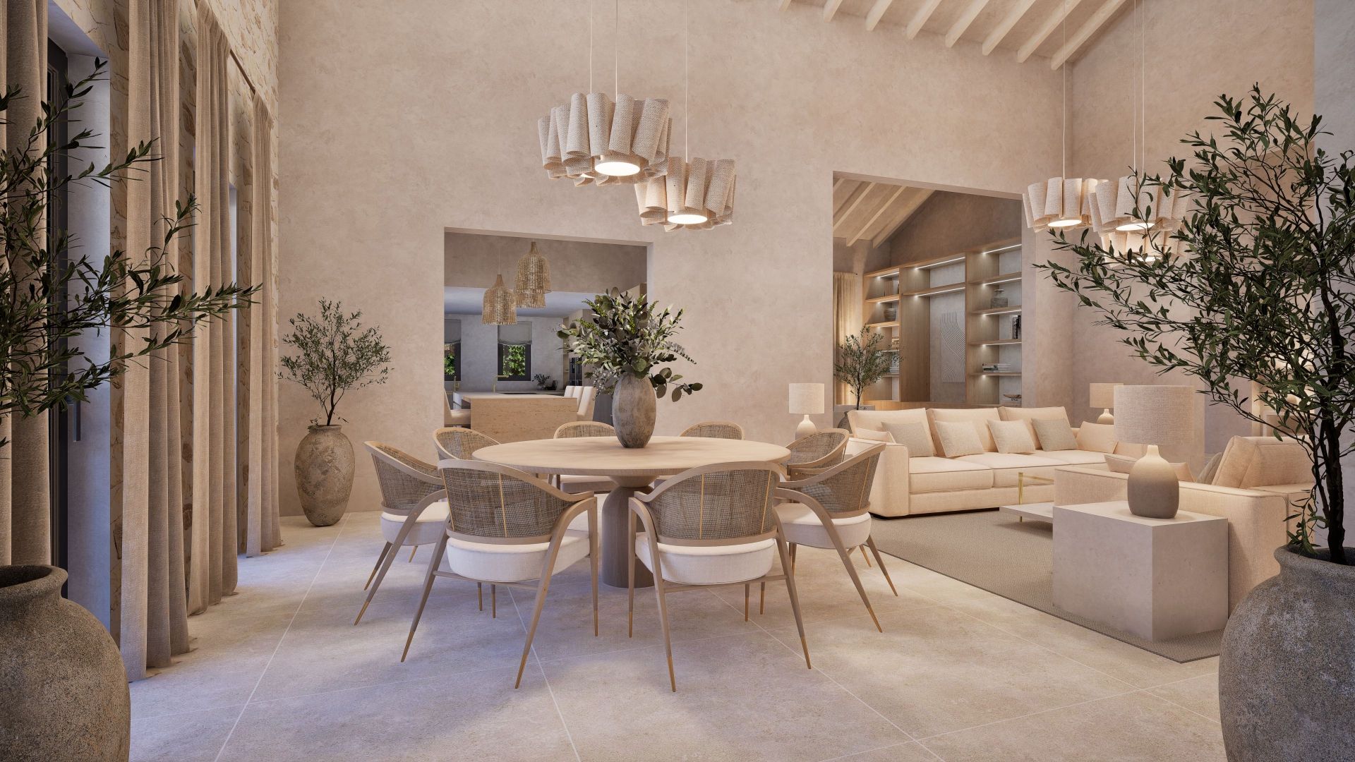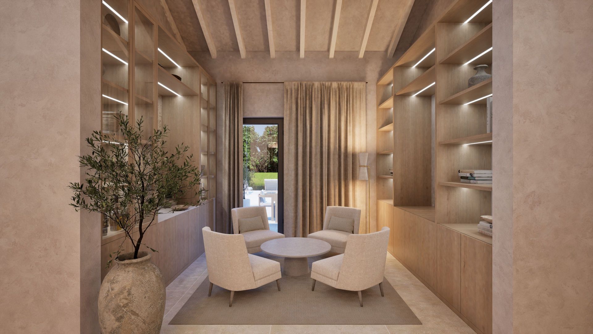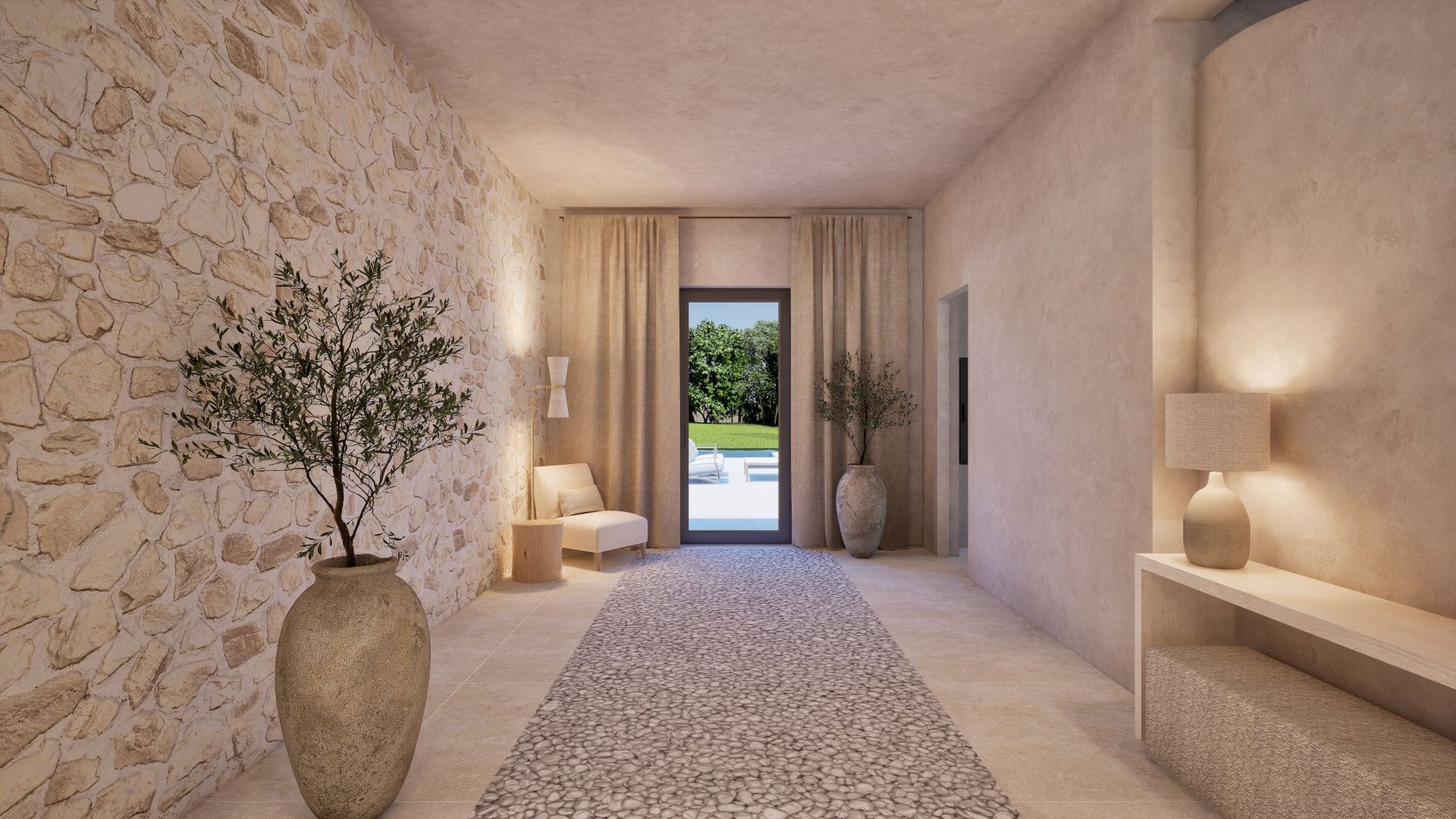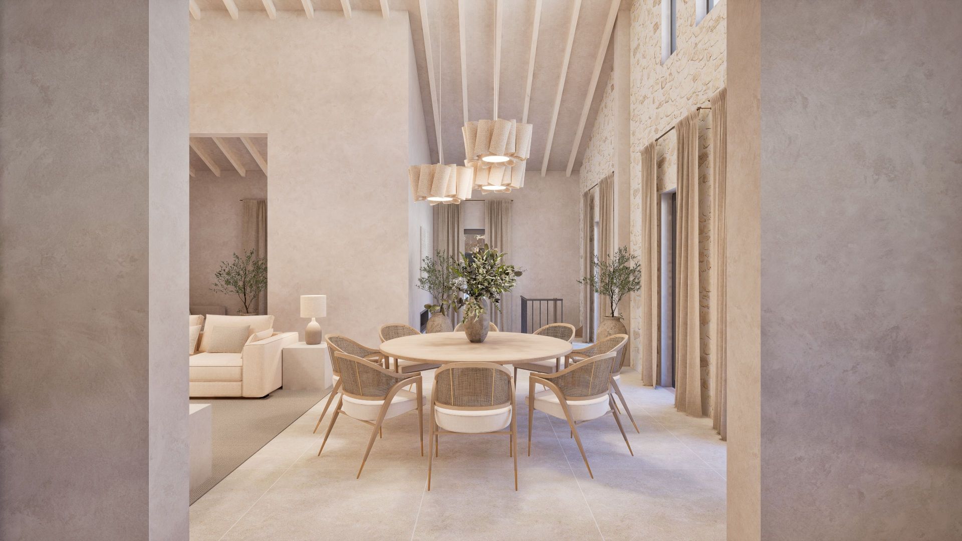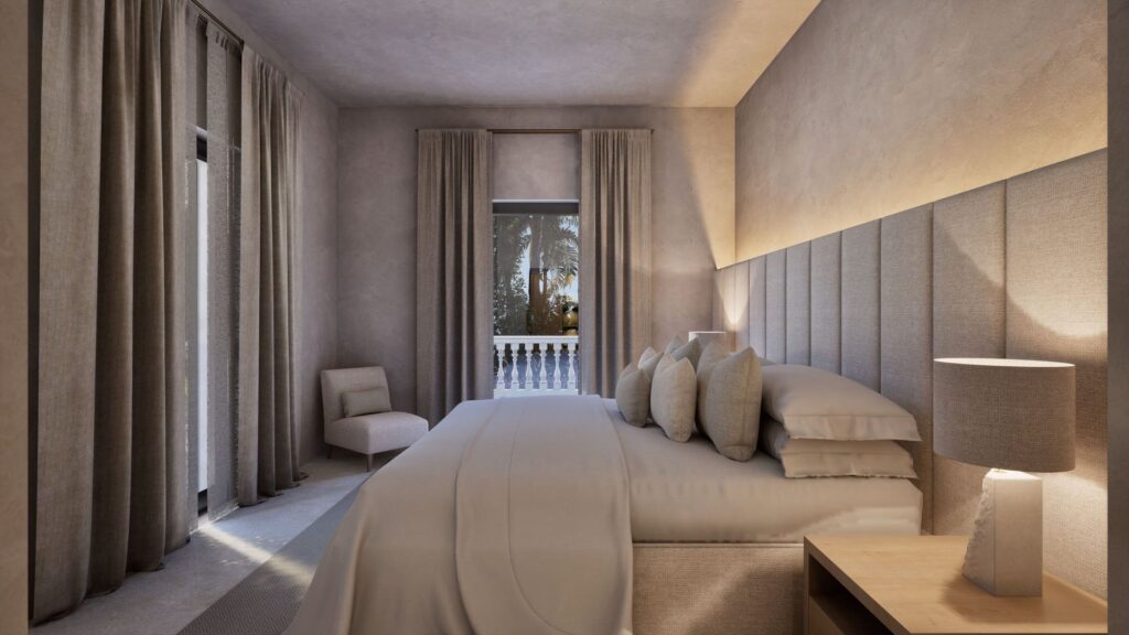 With a total build area of 546 sqm, the residence offers six spacious bedrooms, each with an en-suite bathroom. The master suite includes a dressing room, stone-finished bathroom and a private terrace with far-reaching views across Formentor Bay and Cap de Formentor. The main living area features vaulted ceilings with exposed stonework and a double-sided fireplace that connects to a secondary lounge.