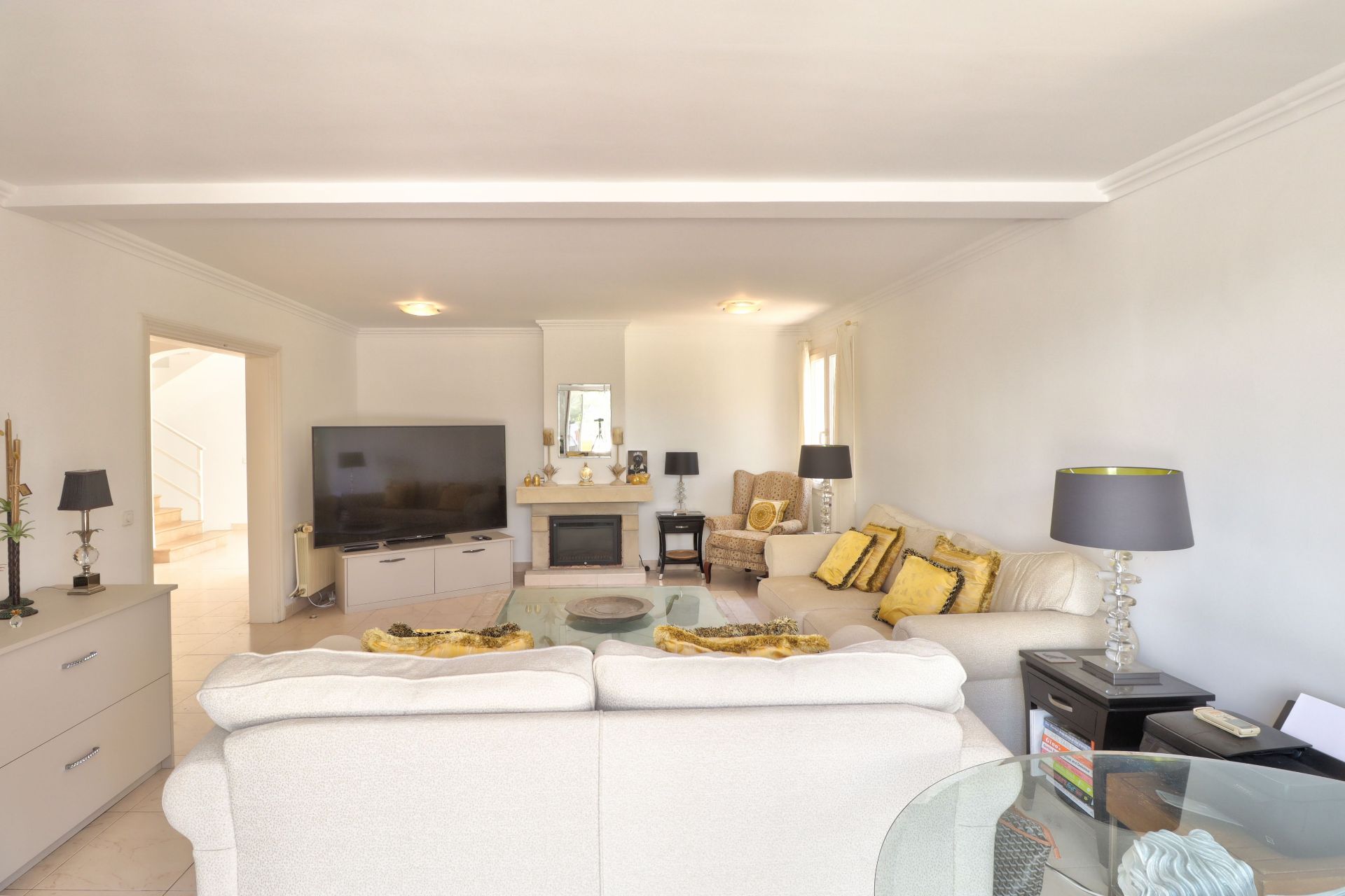 The villa is arranged across bright and spacious interiors, offering three bedrooms and three bathrooms. The living spaces are filled with natural light, and the design provides flexibility for a family lifestyle. A terrace on the upper level creates an additional outdoor area, ideal for enjoying winter sun or evening views.