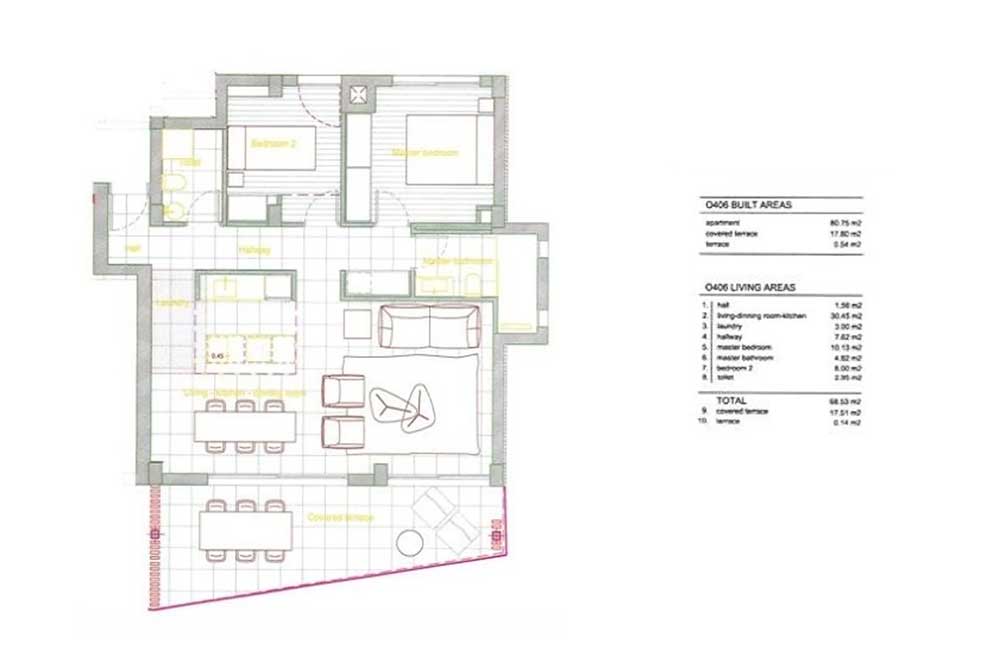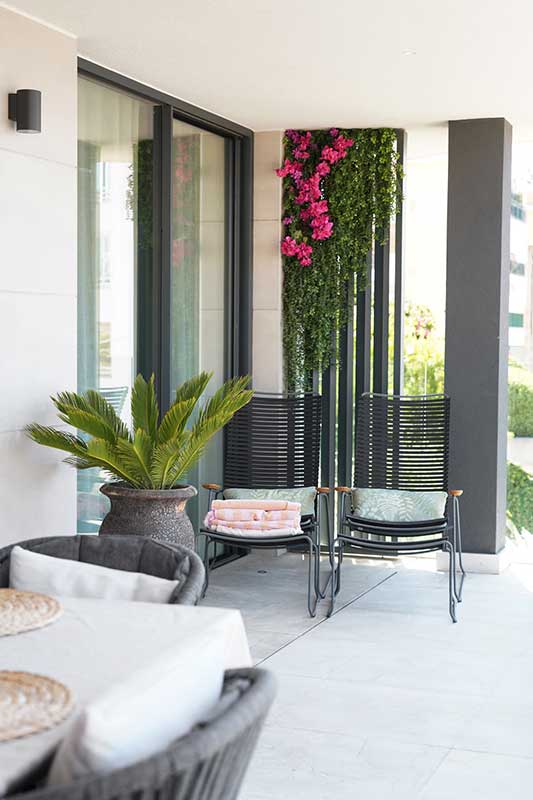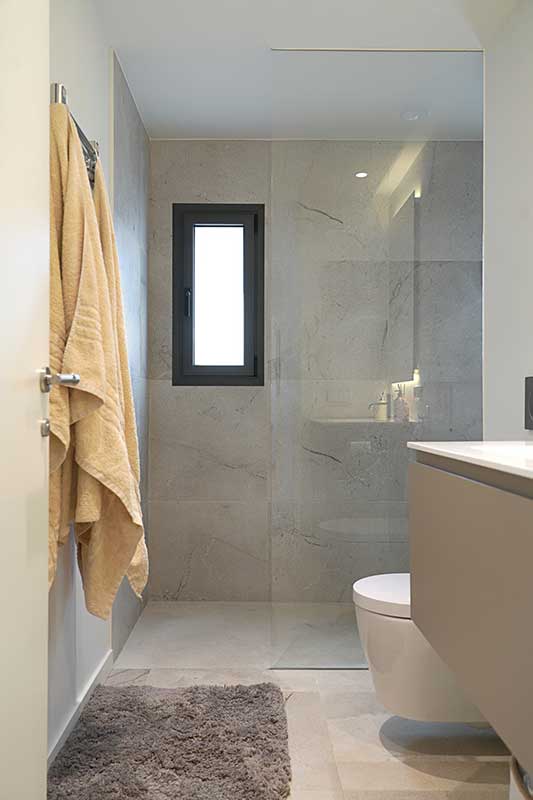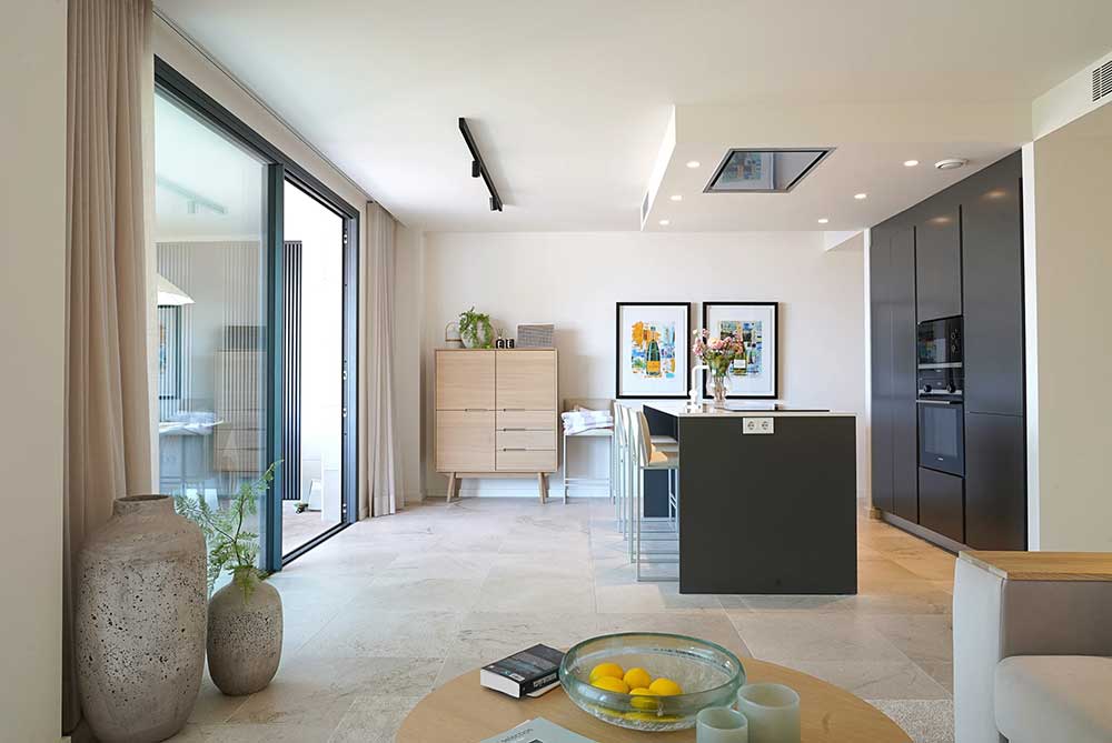 Situated on the fourth floor of an exclusive residential building with an elevator, this newly built property enjoys sea views from the living room, kitchen, and private terrace. The internal layout includes two bedrooms and two bathrooms, one of them en-suite, along with a spacious open-plan kitchen and living area. The kitchen is fitted with Siemens appliances and connects directly to the 18 sqm terrace, which benefits from a southwest orientation and sunlight throughout most of the day.