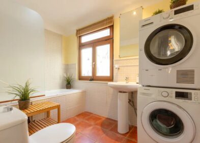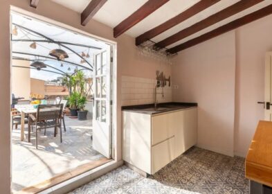 This characterful duplex spans 110 sqm across two levels and retains authentic details such as exposed wooden beams, high ceilings, and handcrafted wooden doors. The main level features a welcoming living area with a fireplace and a bright open layout that includes the dining space and a fully equipped kitchen. Large windows overlook a peaceful courtyard, filling the interior with natural light.