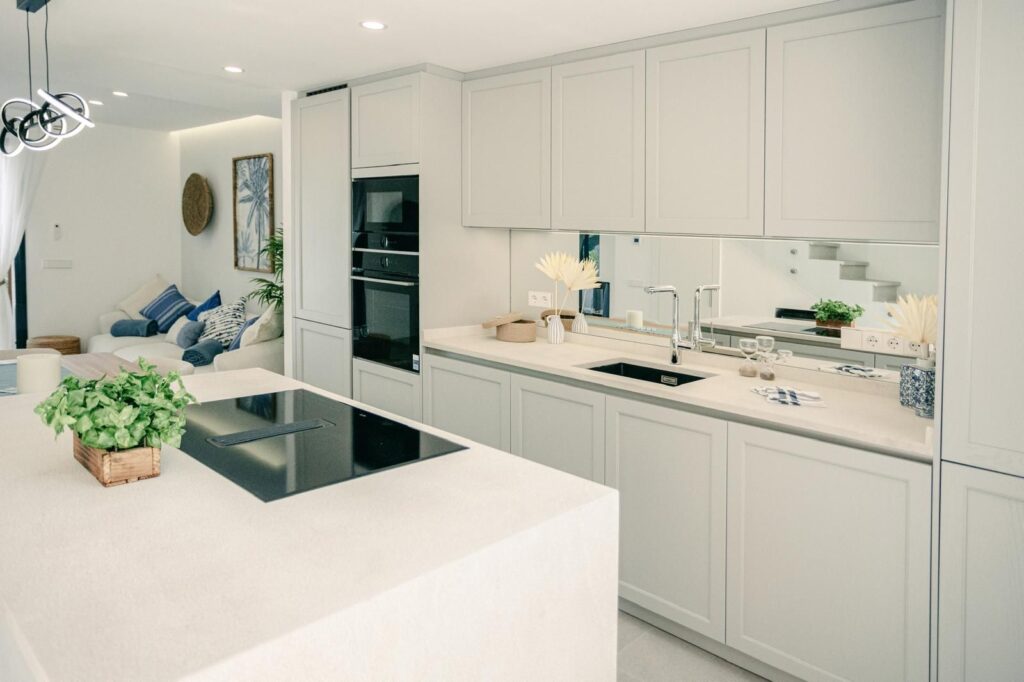 The modern fitted kitchen and open-plan living area create a bright, sociable environment ideal for both relaxing and entertaining. Additional features include storage space, double-glazed windows, and a private parking space within the community garage—an essential advantage in Santa Ponsa’s central area.