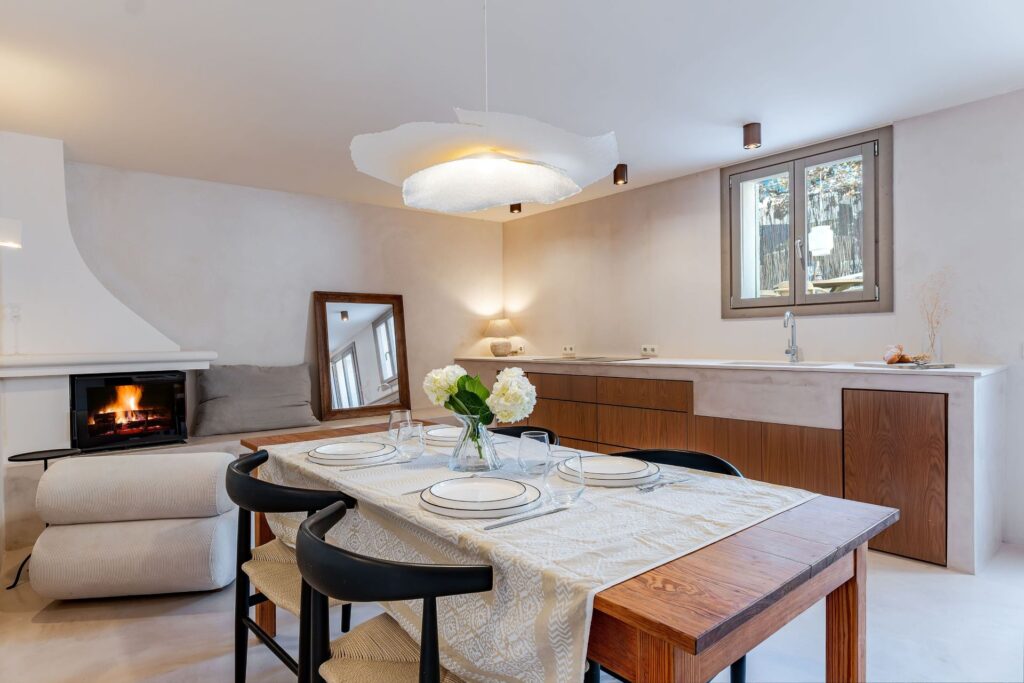 The interior preserves original features such as exposed wooden beams, natural stone elements and a well-maintained water cistern, all complemented by refined contemporary finishes. Underfloor heating, air conditioning and quality materials ensure year-round comfort. The ground floor combines a bright living space with a modern open plan kitchen and an inviting dining area that includes an original fireplace. From here, doors lead directly to a private terrace equipped with a full outdoor kitchen and a heated saltwater pool, creating an appealing setting for outdoor dining and relaxation in all seasons. This level also includes a generous bedroom and a full bathroom.