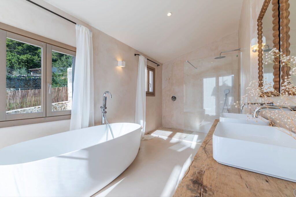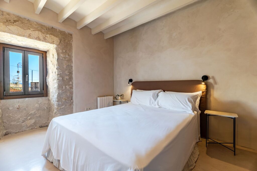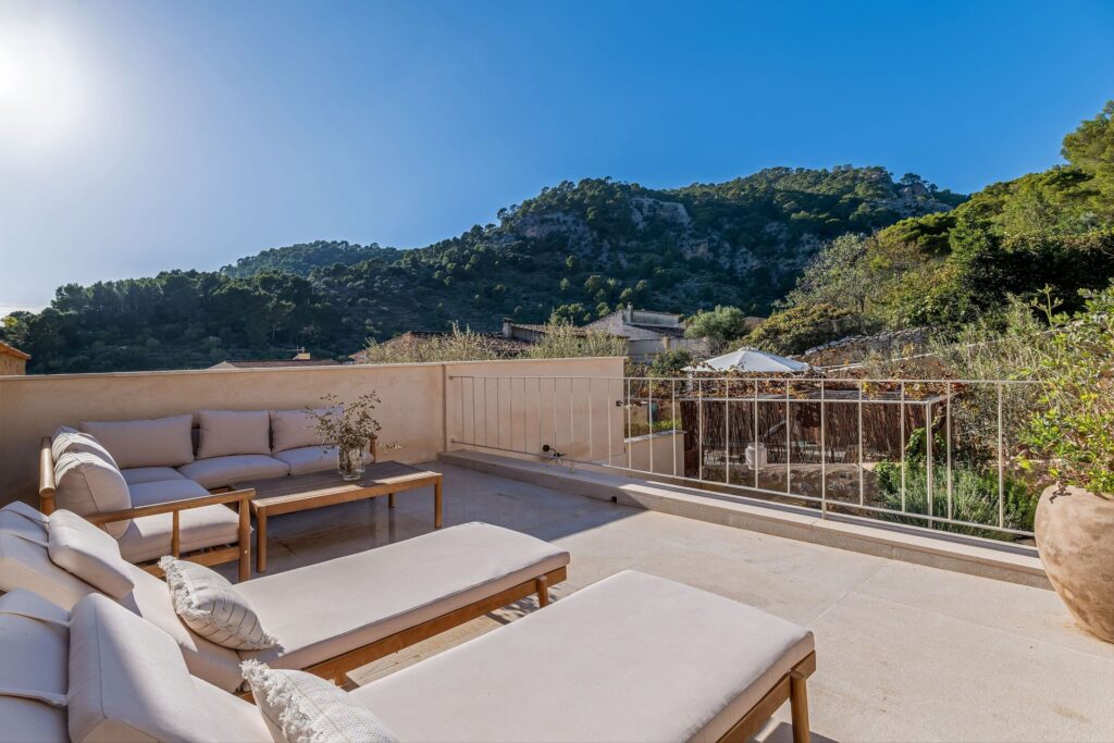 The upper floor offers two additional bedrooms, a spacious bathroom and a walk-in wardrobe. A terrace on this level connects directly to the pool area and captures wide views over the Serra de Tramuntana, reinforcing the sense of privacy and connection to the surrounding landscape.