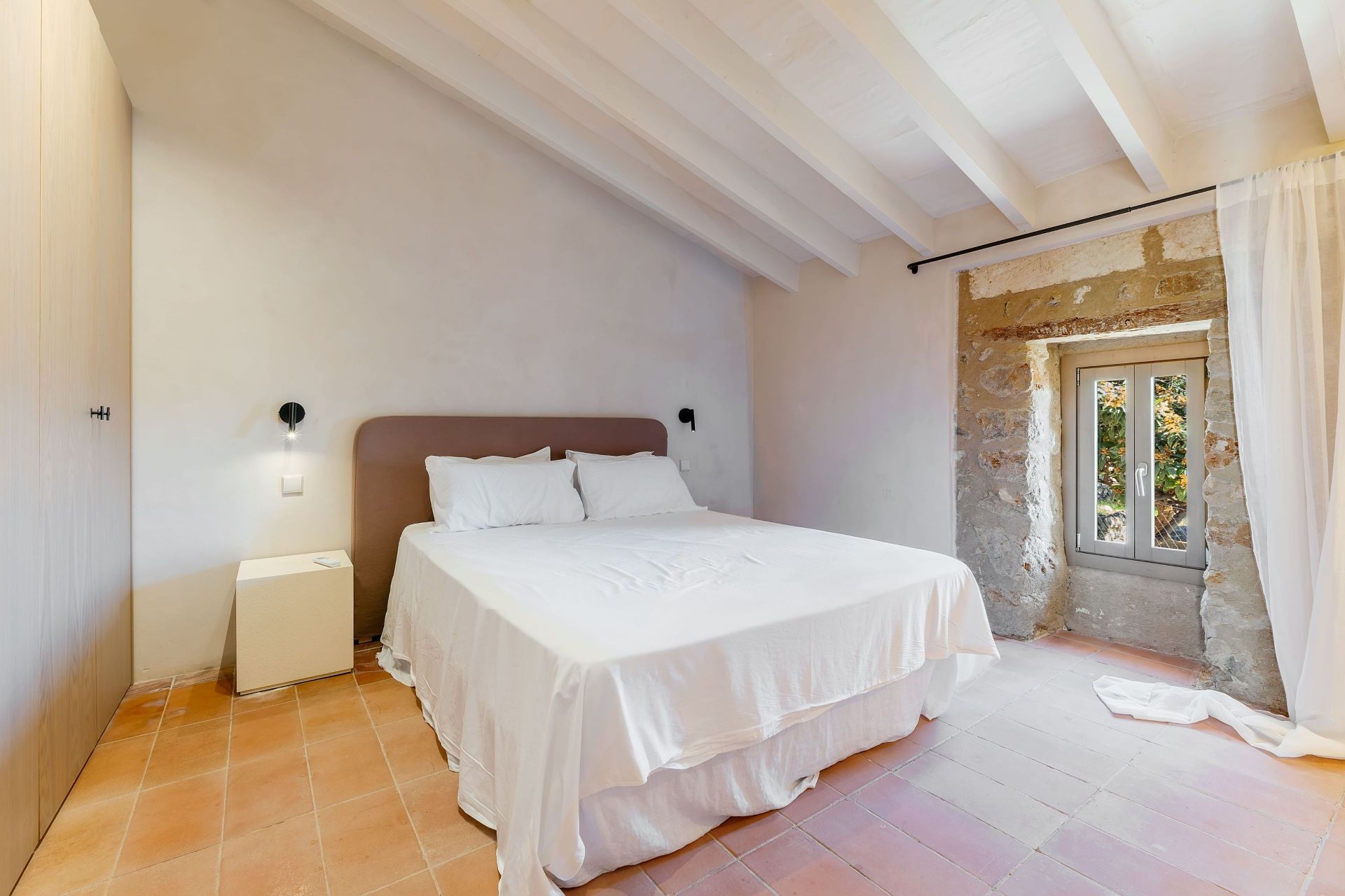 The upper floor offers two additional bedrooms, a spacious bathroom and a walk-in wardrobe. A terrace on this level connects directly to the pool area and captures wide views over the Serra de Tramuntana, reinforcing the sense of privacy and connection to the surrounding landscape.