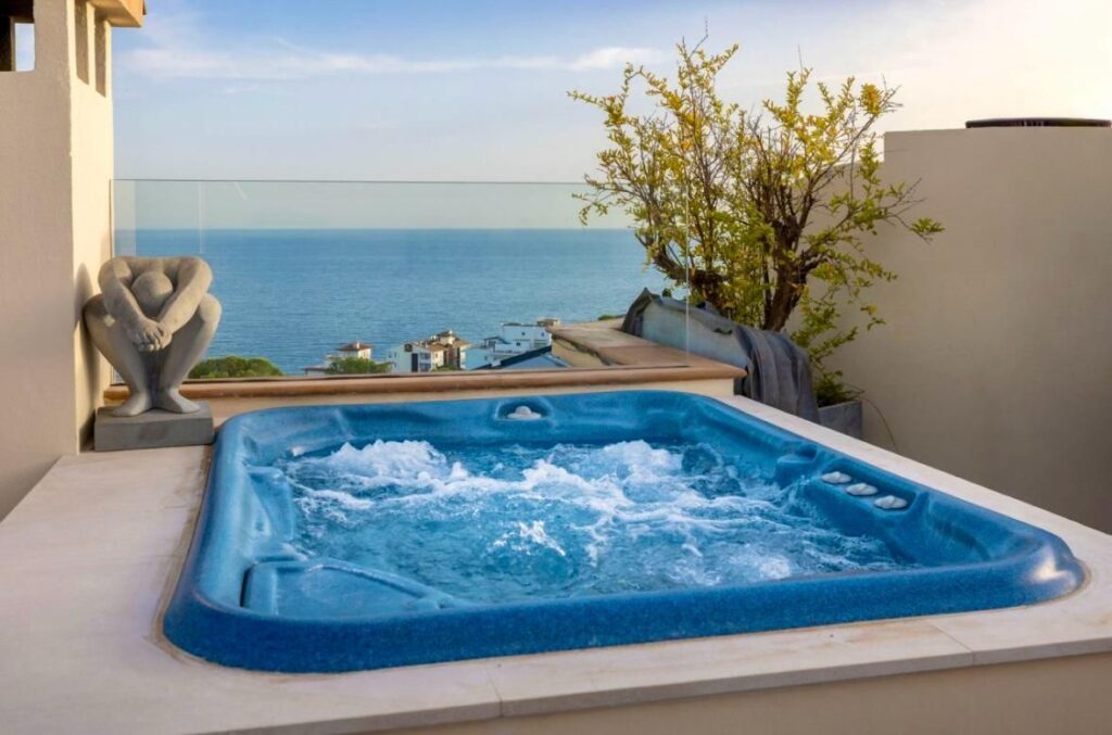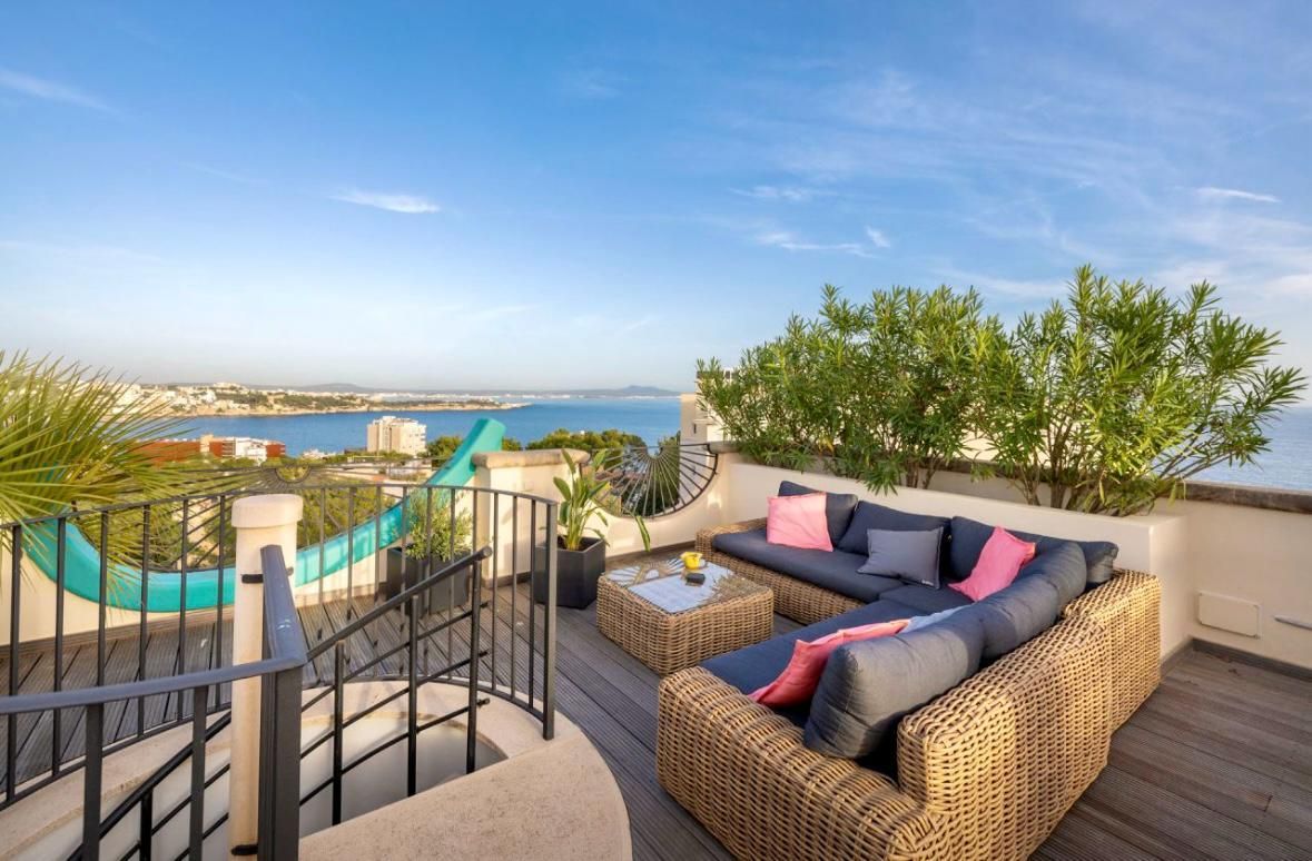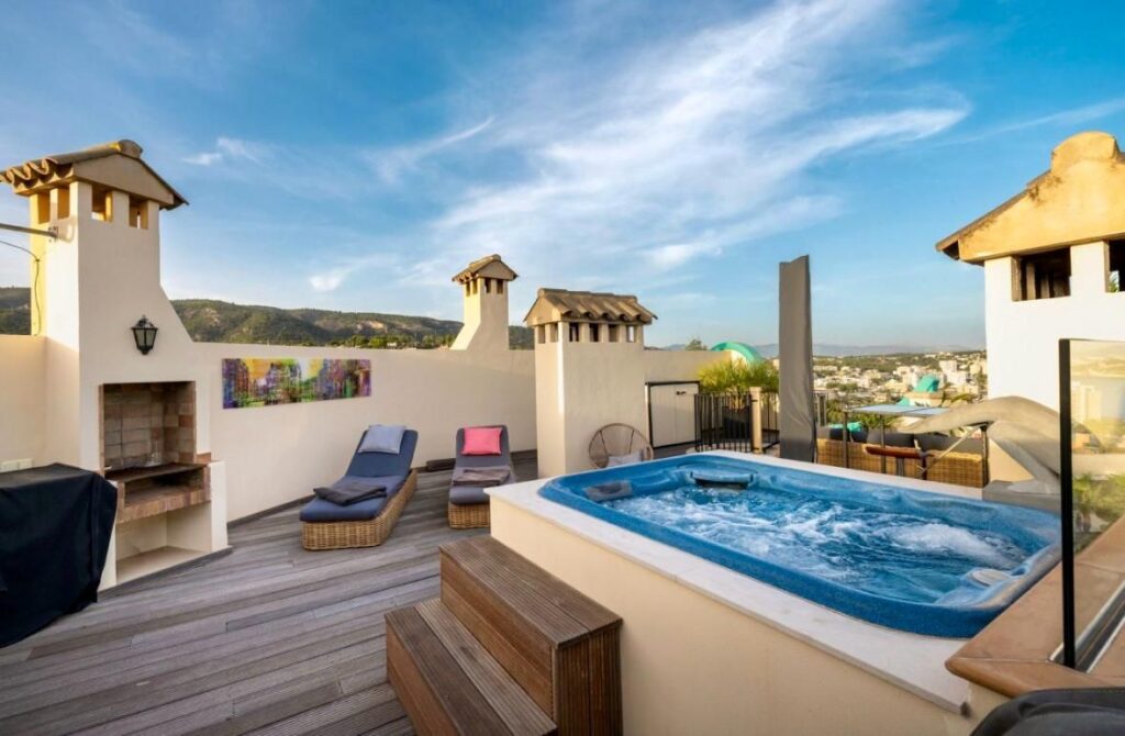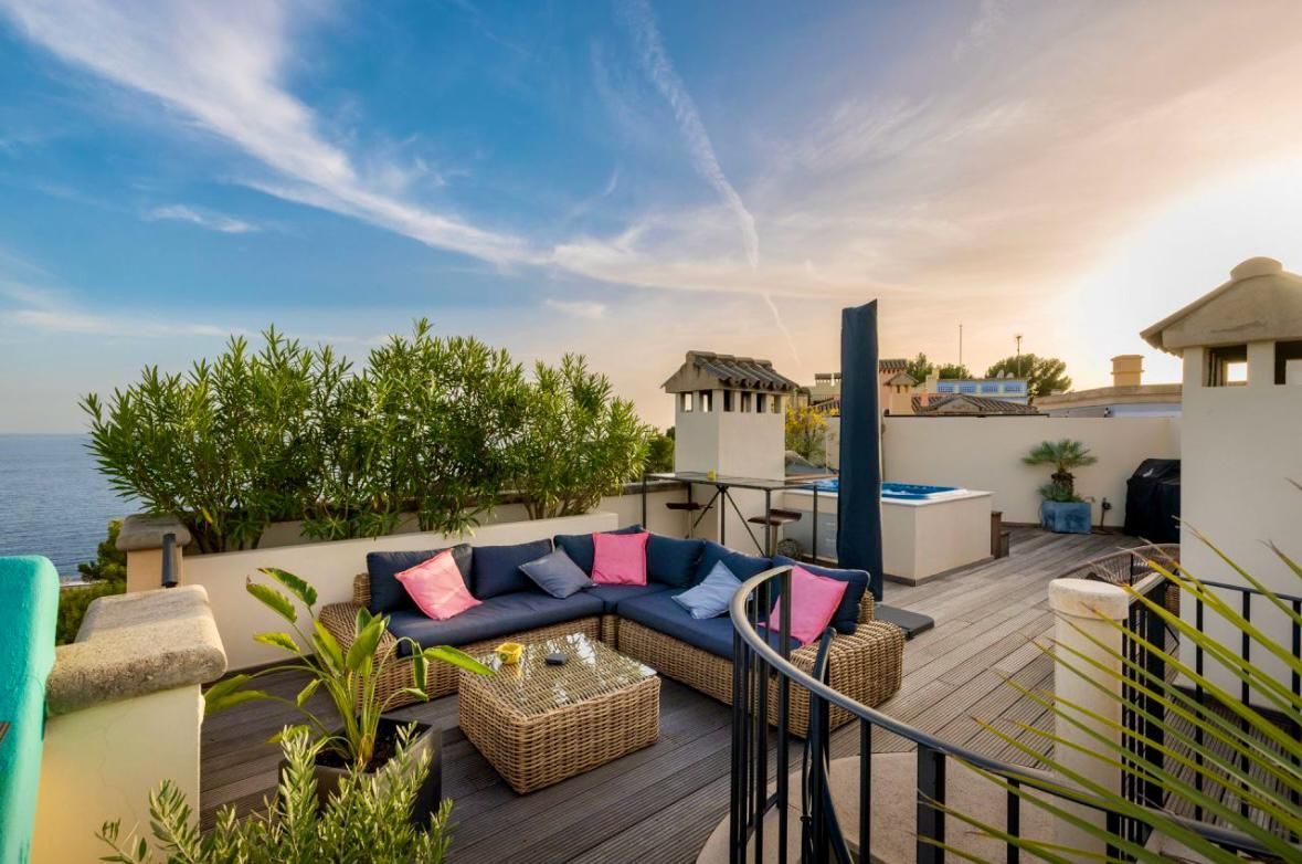 The defining feature of the property is the approximately 75 sqm private roof terrace positioned above the apartment. This outdoor space offers uninterrupted views across the Bay of Palma and has been arranged as a fully equipped outdoor living area. The terrace includes a jacuzzi, outdoor kitchen for dining, an outdoor shower and lounge areas positioned to enjoy the surrounding sea views.