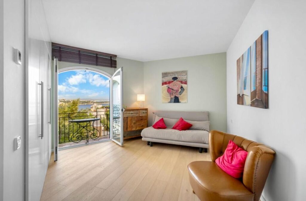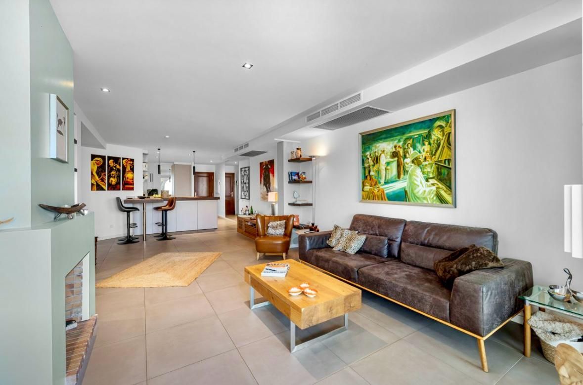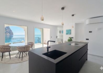 The apartment offers approximately 138 sqm of interior living space and has been completely renovated with a focus on both contemporary Mediterranean design and upgraded technical infrastructure. Large windows maximise natural light and frame open sea views, while the interior layout centres around a spacious open-plan living and dining area connected directly to a modern kitchen.