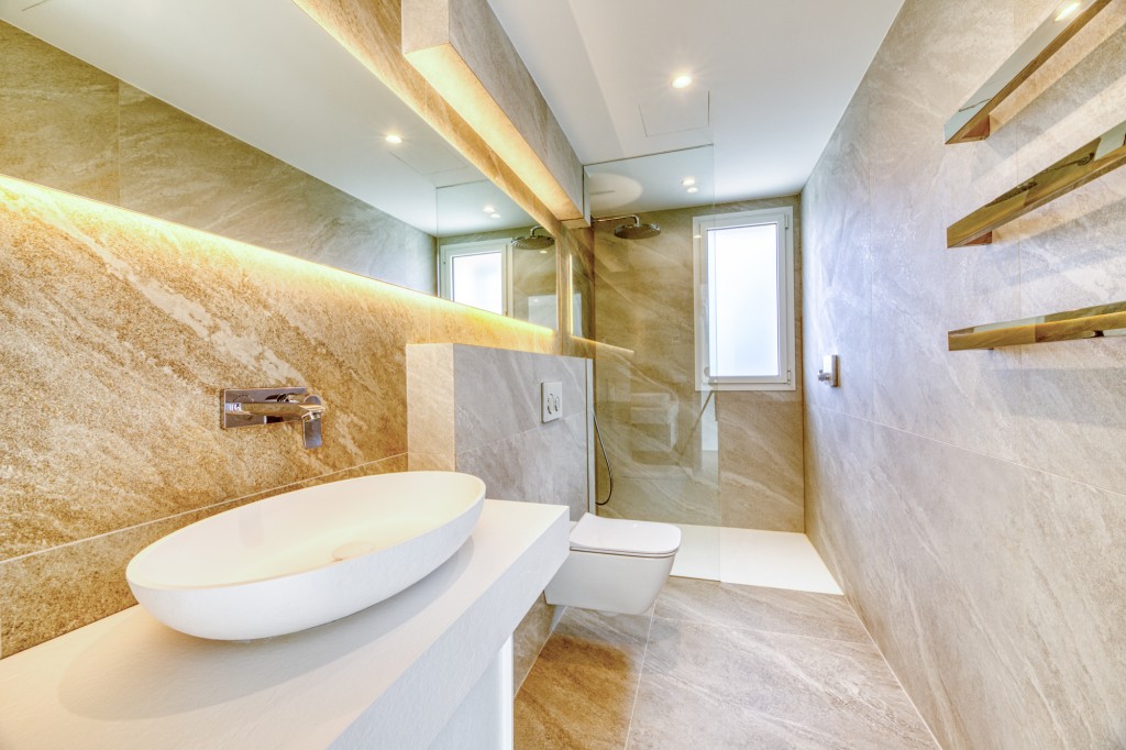 Accommodation is arranged over two levels. On the ground floor is a guest bedroom with adjacent shower room, while the first floor offers three further bedrooms, including the master suite with custom wardrobes, en-suite bathroom, bathtub and walk-in shower. Two additional bedrooms share a bathroom finished with Hans Grohe and Aquabella fittings.