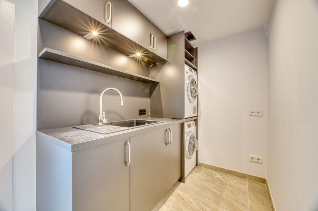 The main floor opens to a bright living area with floor-to-ceiling windows and glass doors that connect directly to the terraces and infinity pool. A fully equipped Miele kitchen with a breakfast bar links seamlessly to the dining and entertaining spaces. A separate utility room adds convenience.