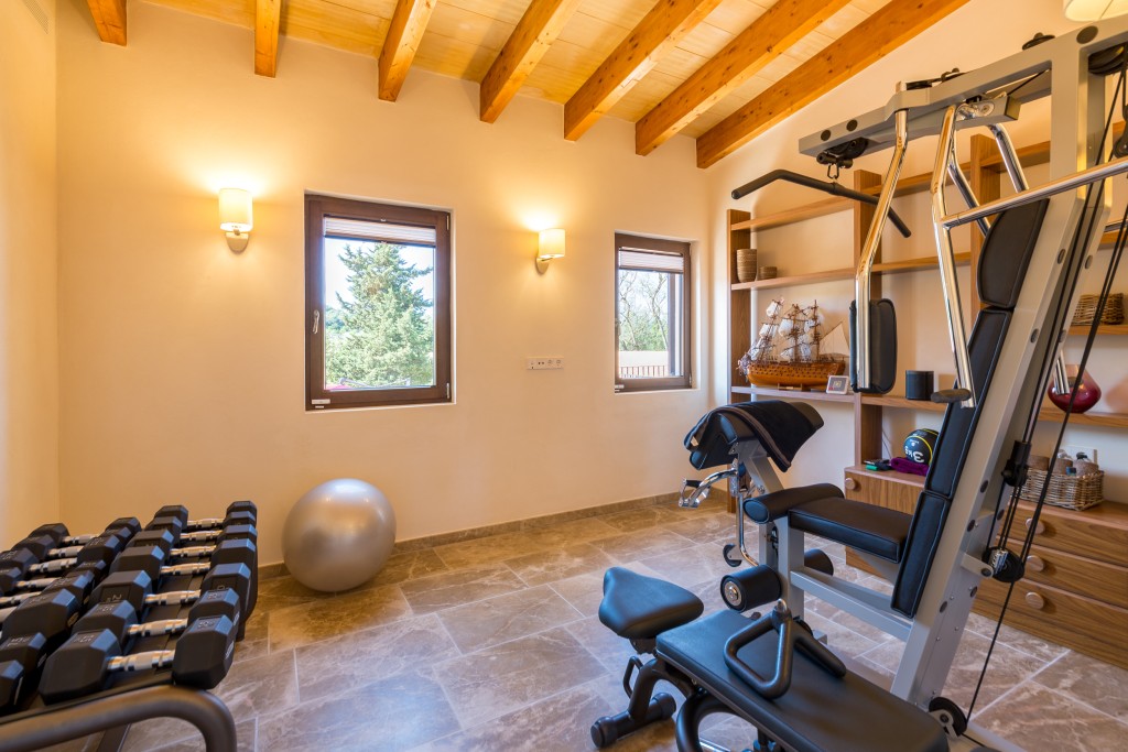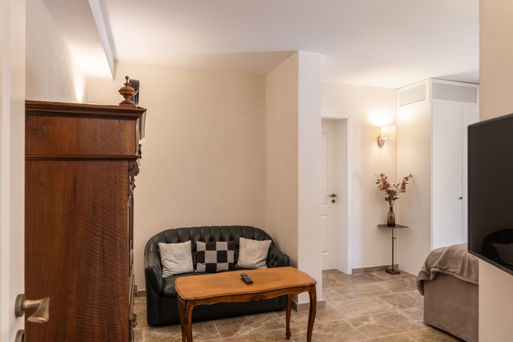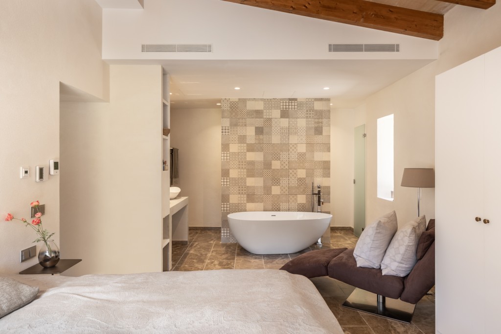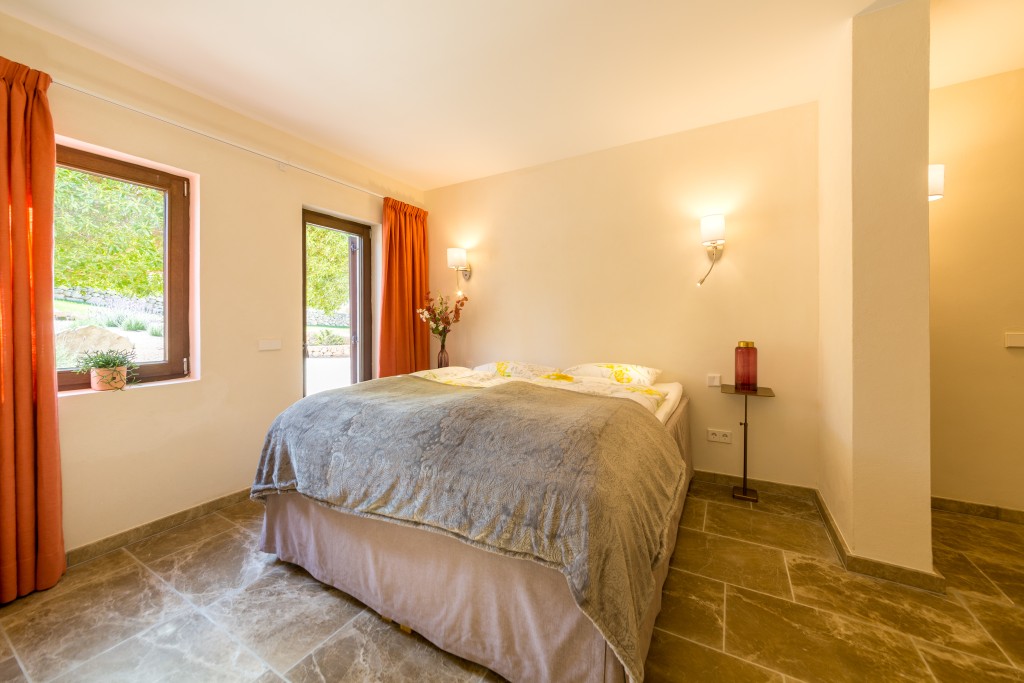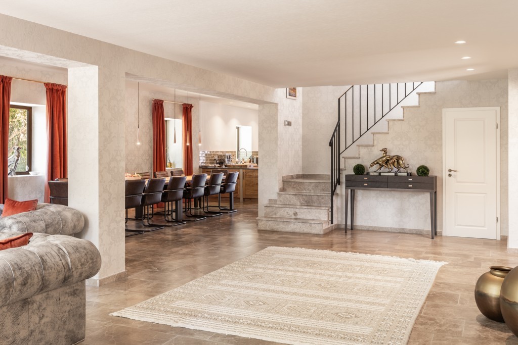 The main house spans 420 sqm and includes six large bedrooms, all with en suite bathrooms, plus a spacious open-plan living, dining, and kitchen area. Original features such as exposed beams and rustic stonework are preserved, while modern amenities include underfloor heating throughout and a solar power system for energy efficiency.