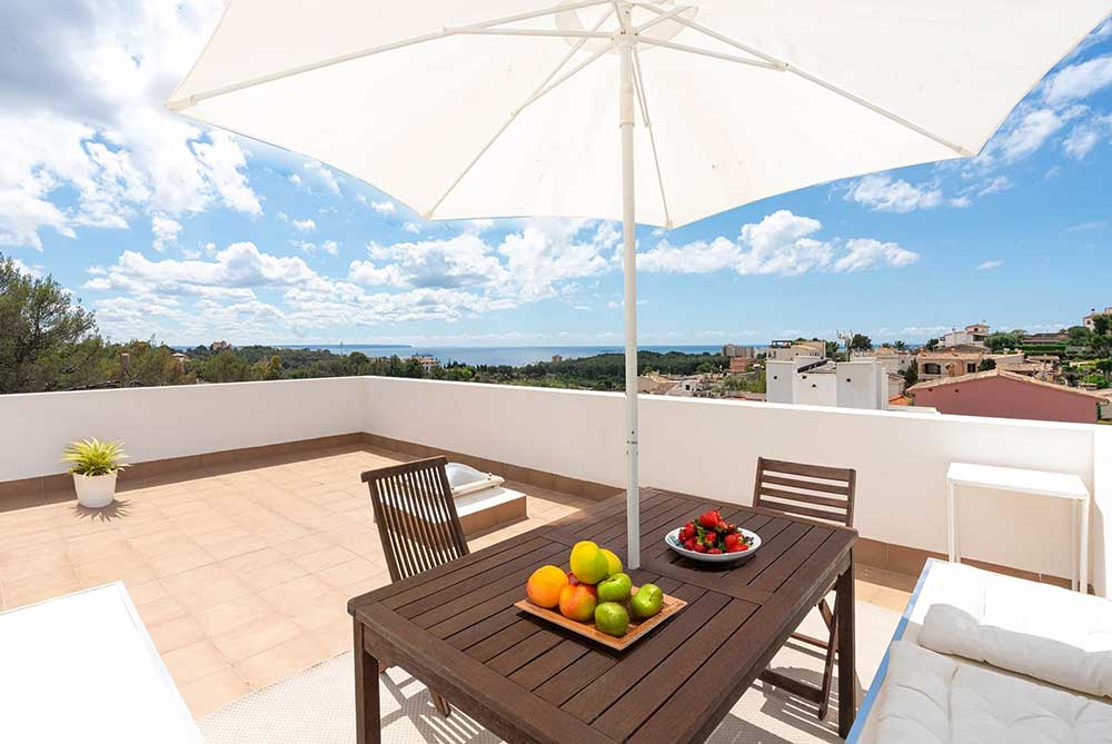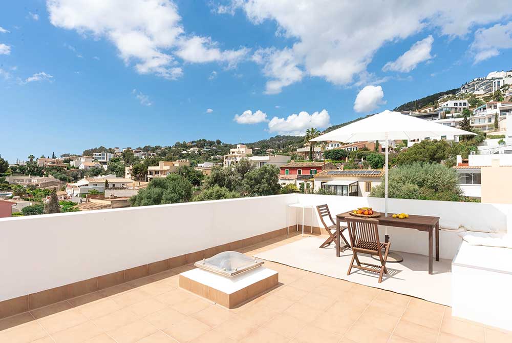 A staircase leads up to a spacious roof terrace, providing open-air living and spectacular views across the sea and Palma. This space is ideal for dining, lounging or simply enjoying the scenery.