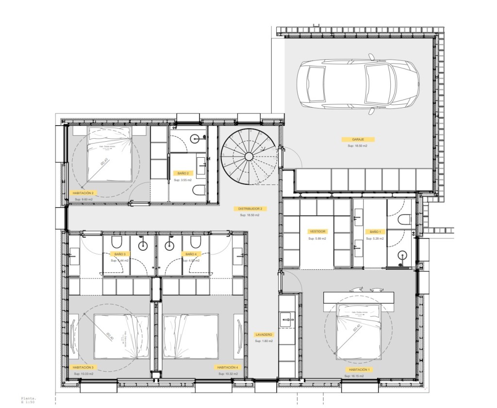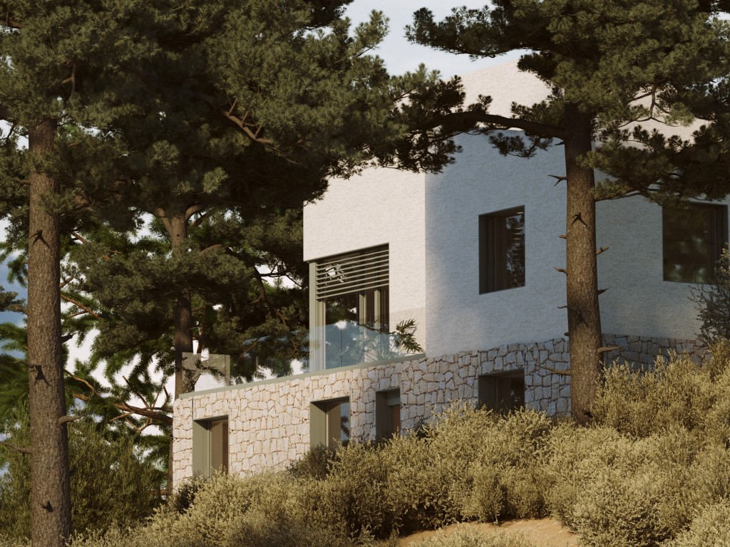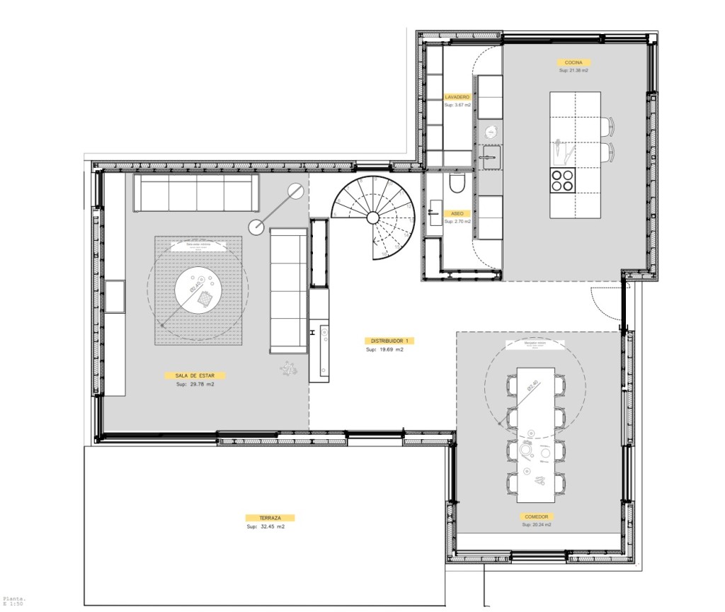 The villa is arranged over two floors. The ground floor features an open-plan living and dining space with a fully fitted kitchen and utility room. High ceilings and a designer circular stairway, vaulted from the ground floor to the first floor, define the central interior. A large terrace of 32 sqm extends from this level, providing an outdoor dining area with views across the valley and coastline.