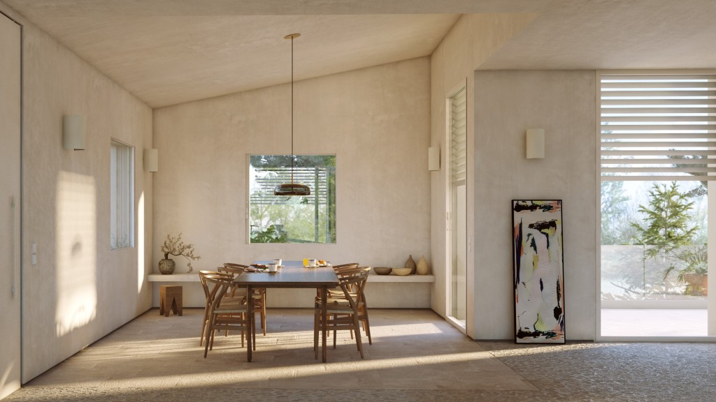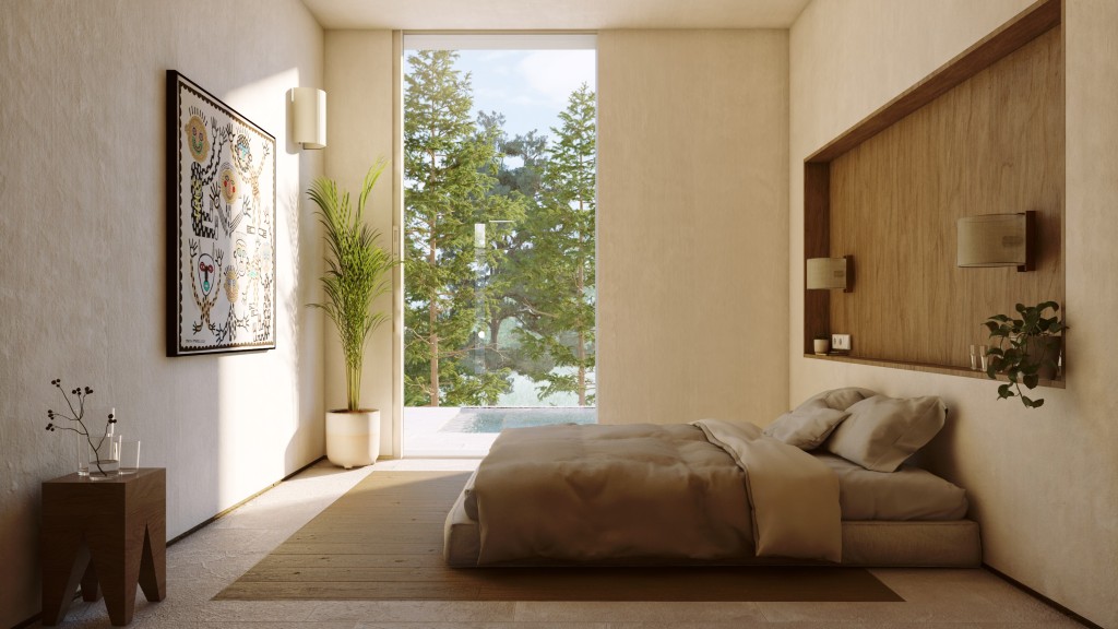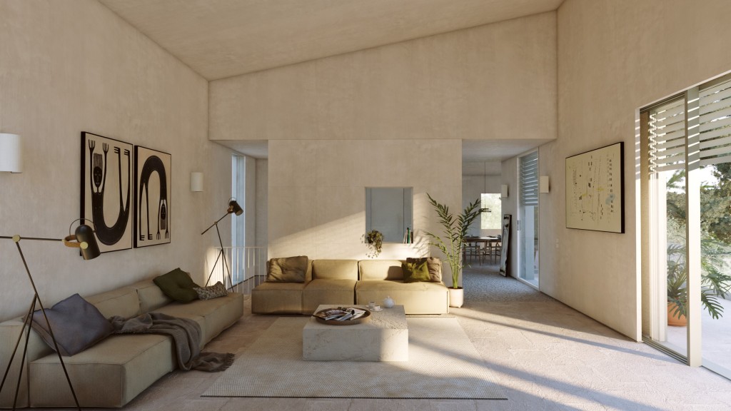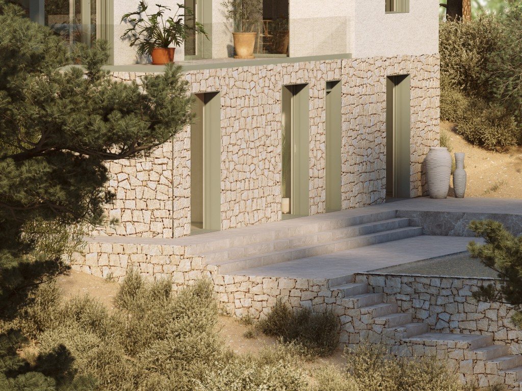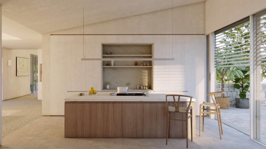 Accommodation includes four bedrooms and four bathrooms. The master suite and guest bedrooms are designed with en-suite bathrooms, modern fittings, and direct access to terraces. The vaulted ceilings and natural stone elements throughout add character to the property’s modern style.