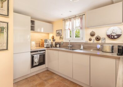 The home is designed around an open-plan living and dining area with an integrated kitchen, creating a practical central space. It includes four bedrooms (with paperwork stating three), three of which have private en-suite bathrooms. A guest toilet adds extra convenience. Two of the bedrooms are on the ground floor, one with direct access to the garden and pool.