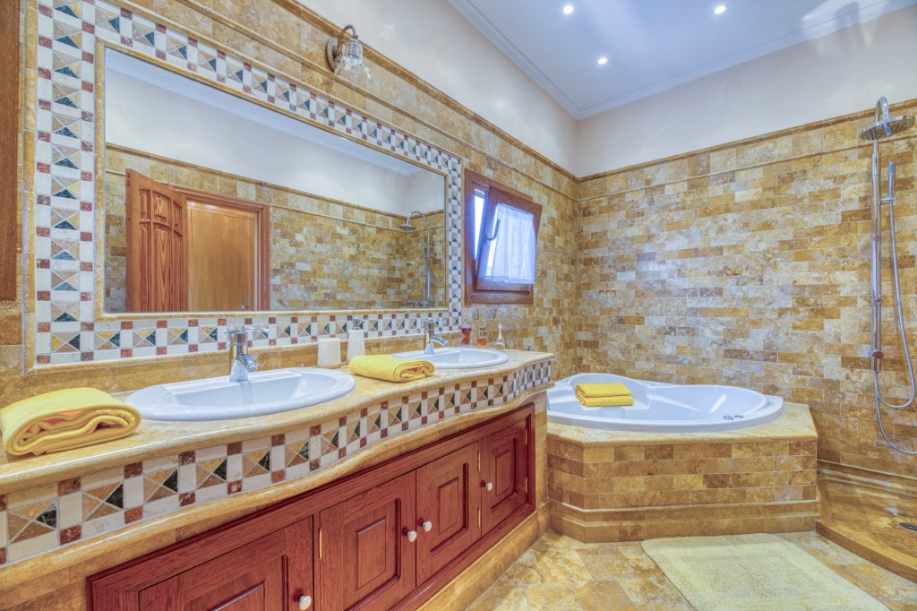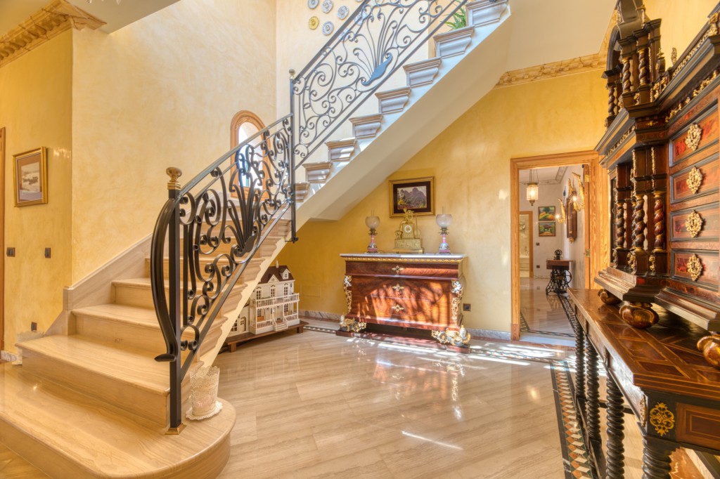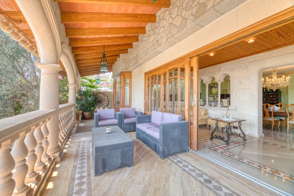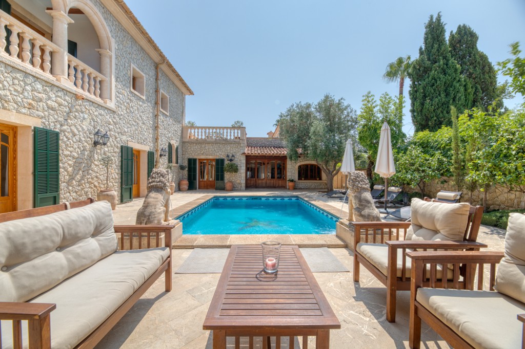 The villa is finished with high-quality materials including Italian marble, Santanyi and Porreres stone, and features ornamental balustrades and columns that enhance its character. Two hand-carved Binissalem stone lions mark the poolside, creating a striking detail within the courtyard garden.