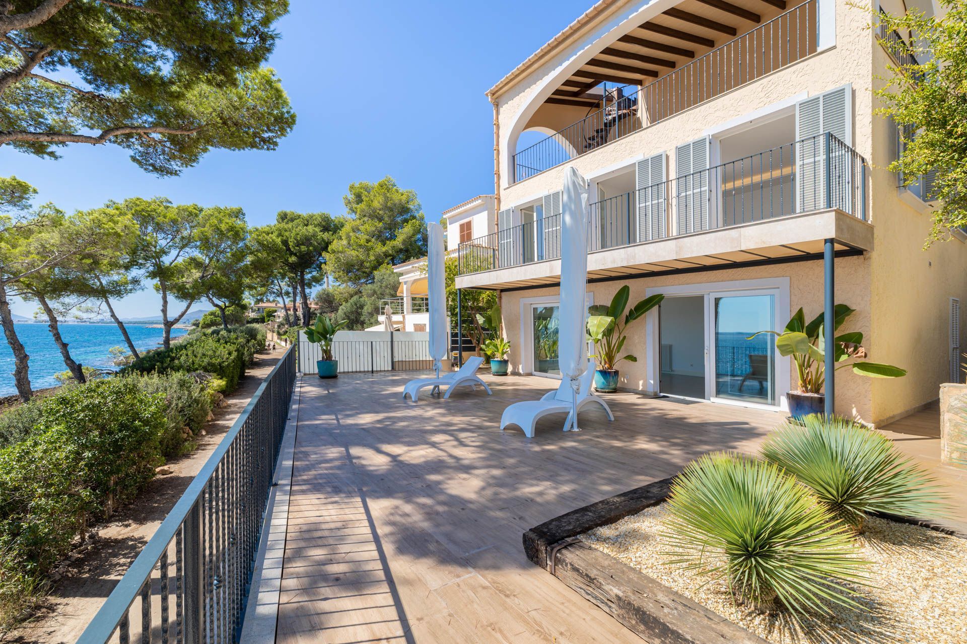This south-facing villa enjoys a privileged position in the sought-after residential area of Alcanada, just moments from the golf course and close to Puerto Alcudia’s amenities. Its waterfront location provides uninterrupted sea views and direct access to the water.